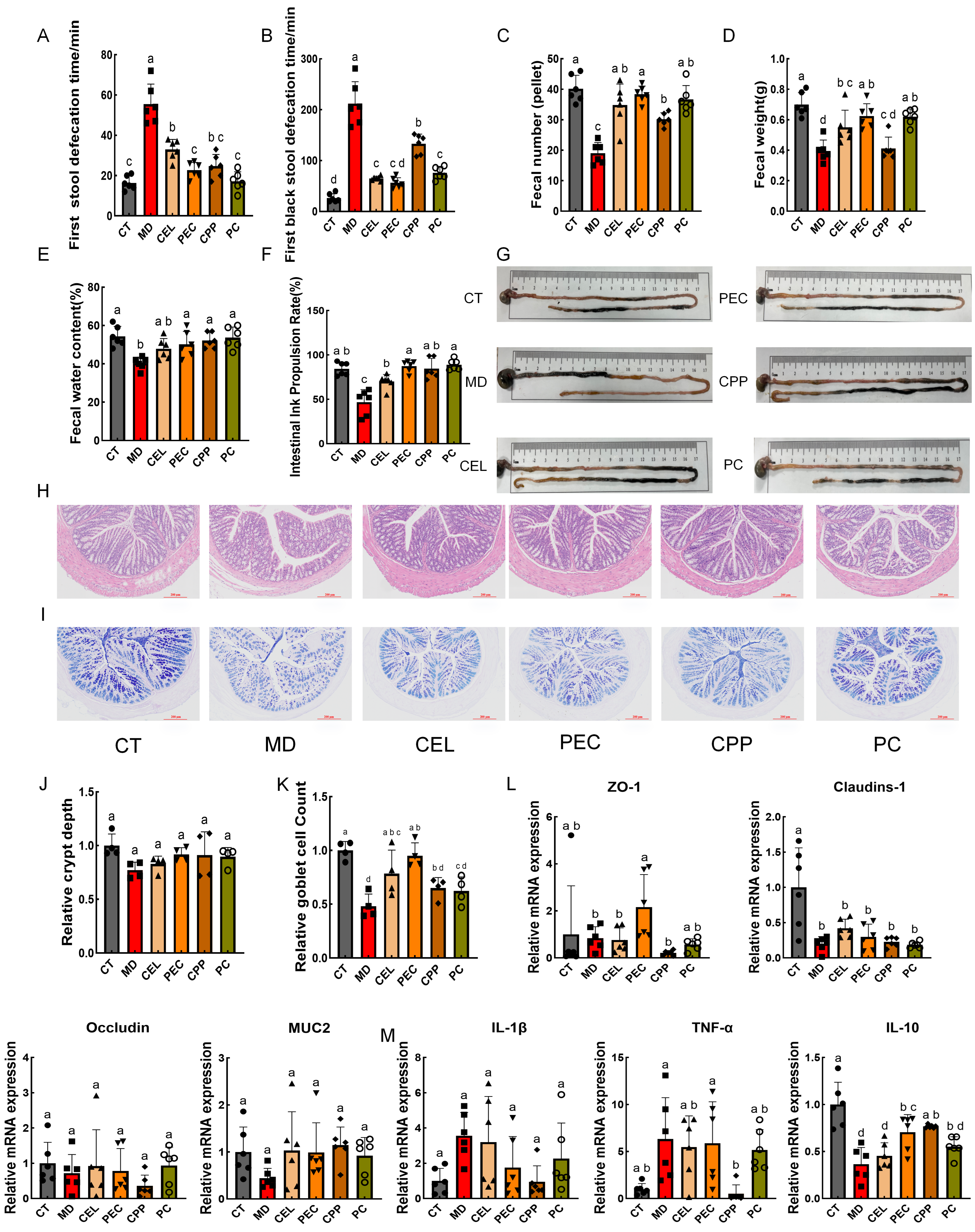 3.3. Effects of CEL, PEC, and CPP on Defecation Ability, Intestinal Structure, and Barrier Function in Mice