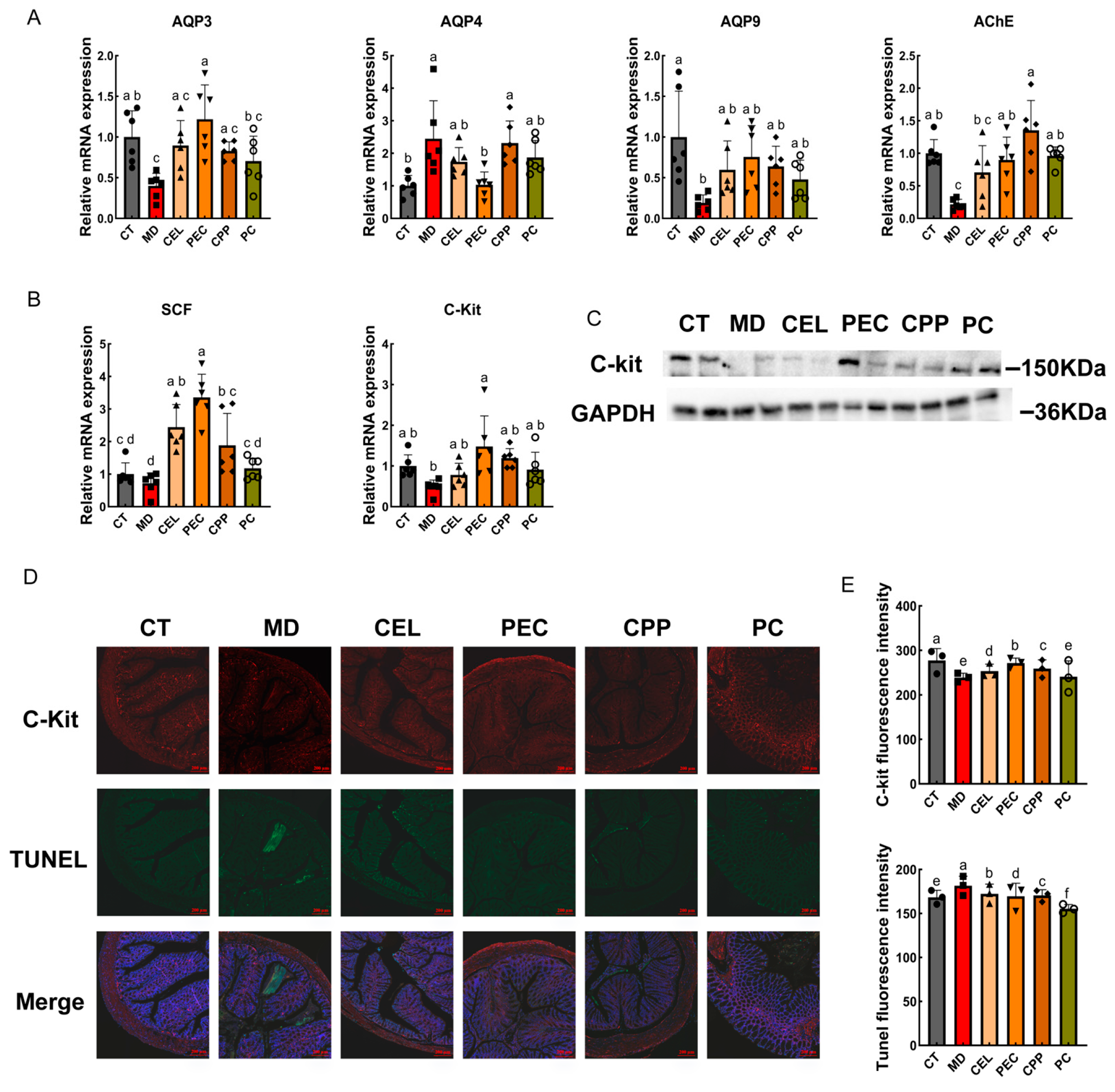 3.4. Effects of CEL, PEC, and CPP on Aquaporin Expression and Motility in Mouse Intestines