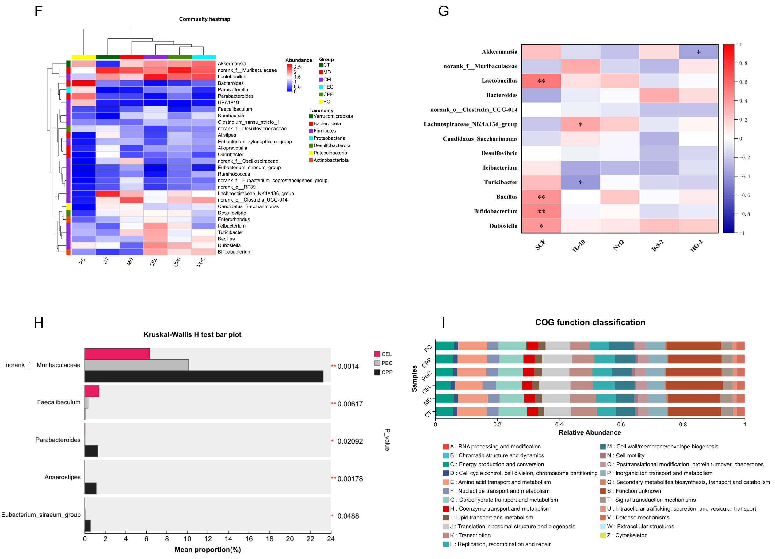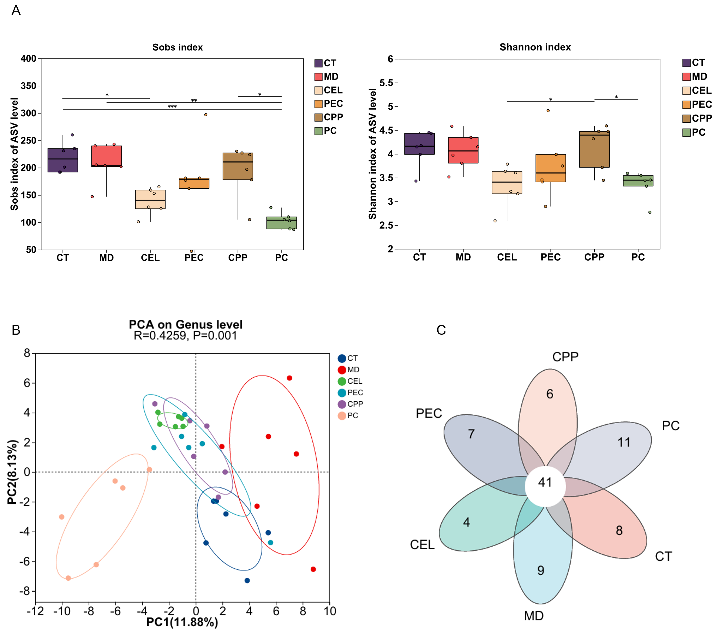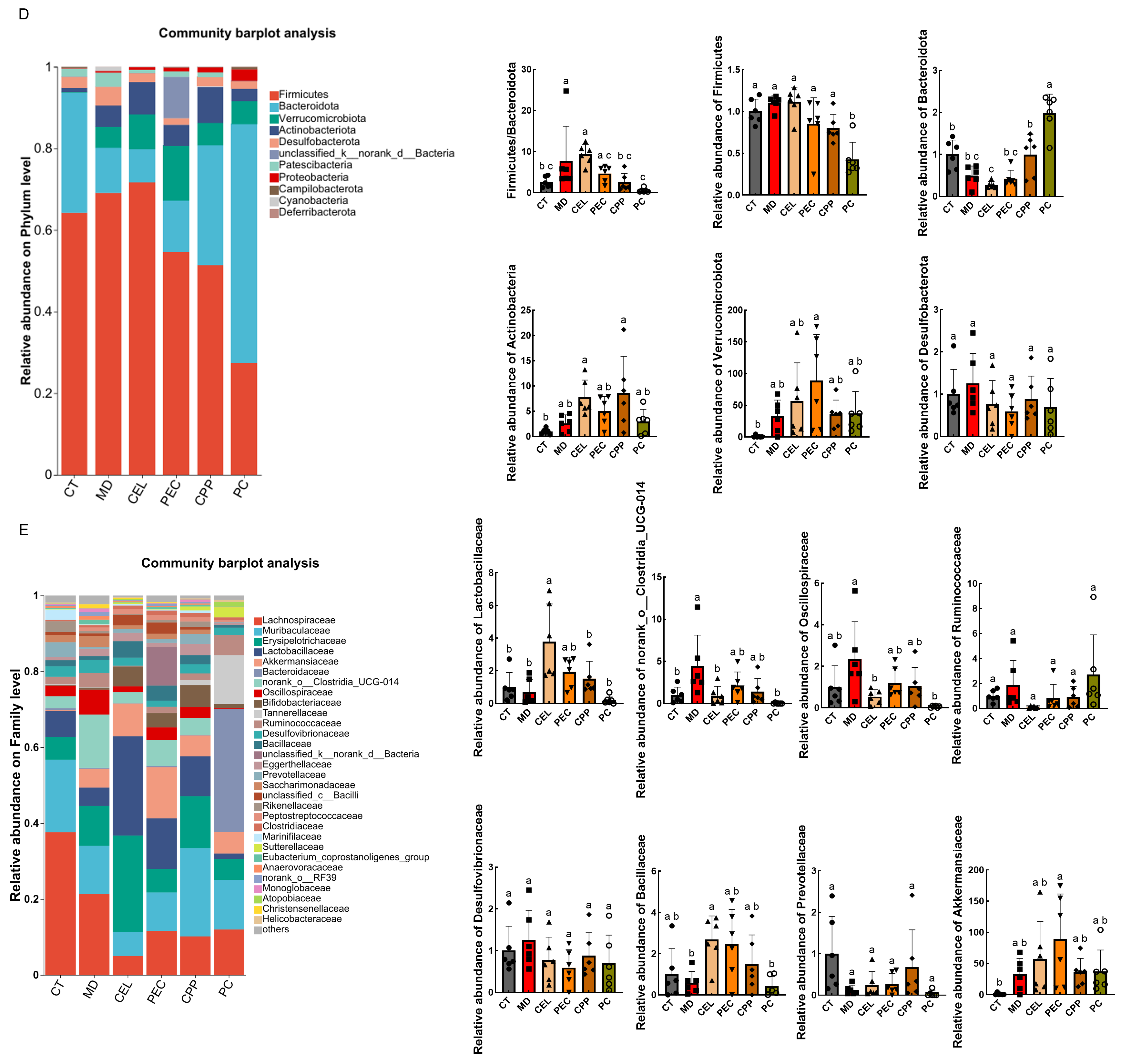 3.6. Effects of CEL, PEC, and CPP on Gut Microbiota Composition in Mice
