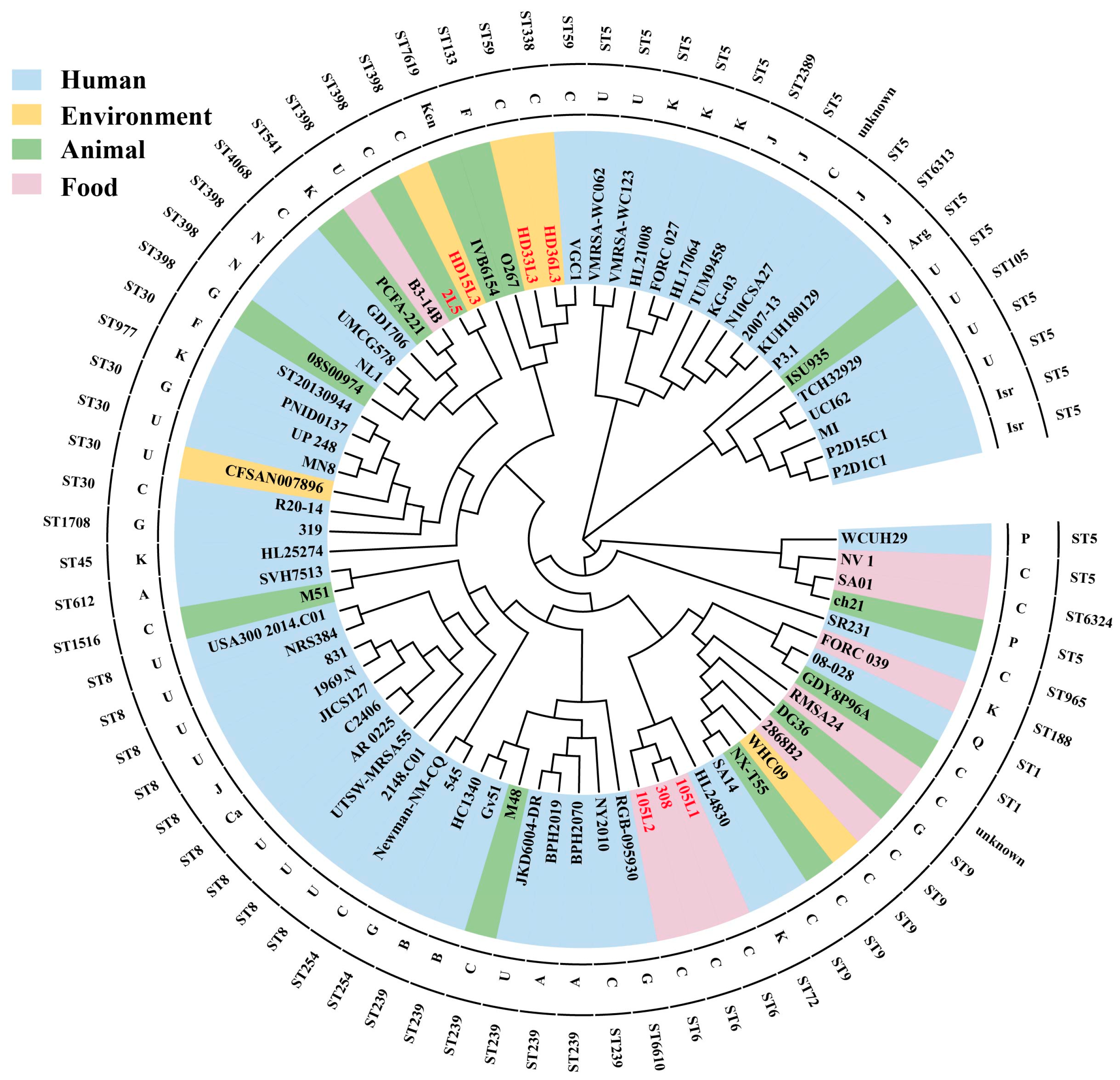 | HD15L3 | Shopping trolley in supermarket 2 | 398 | exoenzyme genes (aur, lip, sspA, sspB, sspC), exotoxin genes (hlgA, hlgB, hlgC, set17, set22, set24, set25, hla, hlb, hld), effector delivery system genes (essA, essB, esaA, esaB, esaG, esxA), immune modulation genes (adsA, capA, cap8B, cap8C, cap8D, cap8E, cap8F, cap8G, cap8M, capN, cap8O, cap8P), nutritional/metabolic factor (isdA, isdB, isdC, isdE, isdF, isdG, isdI, srtB), biofilm factor (icaA, icaC, icaR, icaD) | aminoglycoside resistance (aac(6′)-aph(2″), ant(6)-Ia, aadD), fluoroquinolone resistance (gyrA: S84L, grlA: S80Y), tetracycline resistance (tet(M), tet(L), tet(K)), folate pathway antagonist resistance (dfrG), beta-lactam resistance (blaZ), amphenicol resistance (fexA), macrolide and lincosamide resistance (erm(T), erm(C)), pleuromutilin and lincosamide resistance (Isa(E)), lincosamide resistance (lnu(B)) |