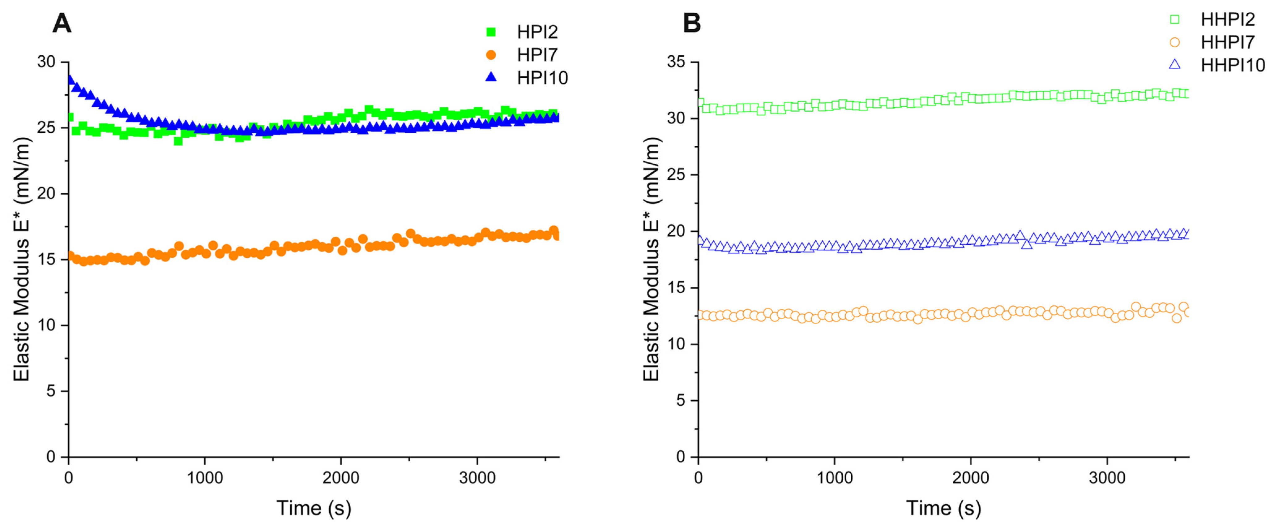 - Zhou, B.; Tobin, J.T.; Drusch, S.; Hogan, S.A. Dynamic Adsorption and Interfacial Rheology of Whey Protein Isolate at Oil-Water Interfaces: Effects of Protein Concentration, pH and Heat Treatment. Food Hydrocoll. 2021, 116, 106640. [Google Scholar] [CrossRef]