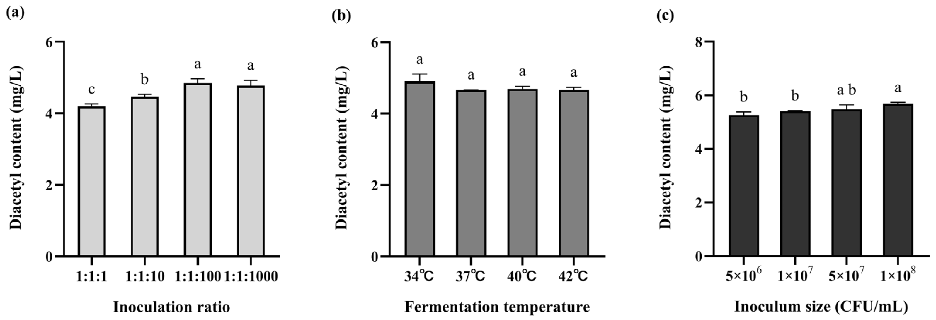 - Tian, H.; Hang, S.; Huang, N.; Yu, H.; Chen, C.; Ge, C. Strain-Level Variation in Diacetyl Production by Lactiplantibacillus plantarum Reveals Genetic Drivers of Flavor in Fermented Dairy. J. Dairy Sci. 2025, 108, 10689–10699. [Google Scholar] [CrossRef]