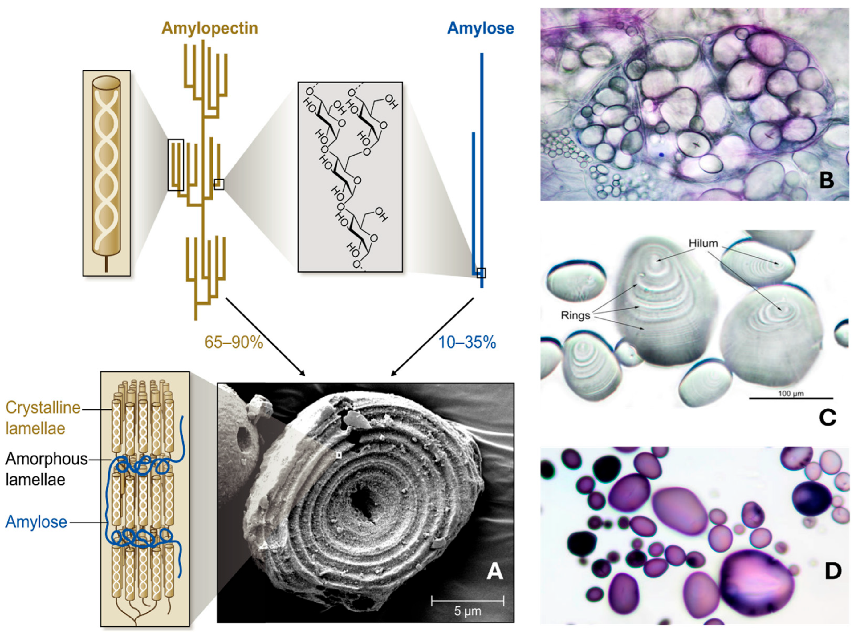 Figure 1C) around which concentric layers of protein are deposited. The presence of starch can be detected using Lugol’s iodine as a staining agent (