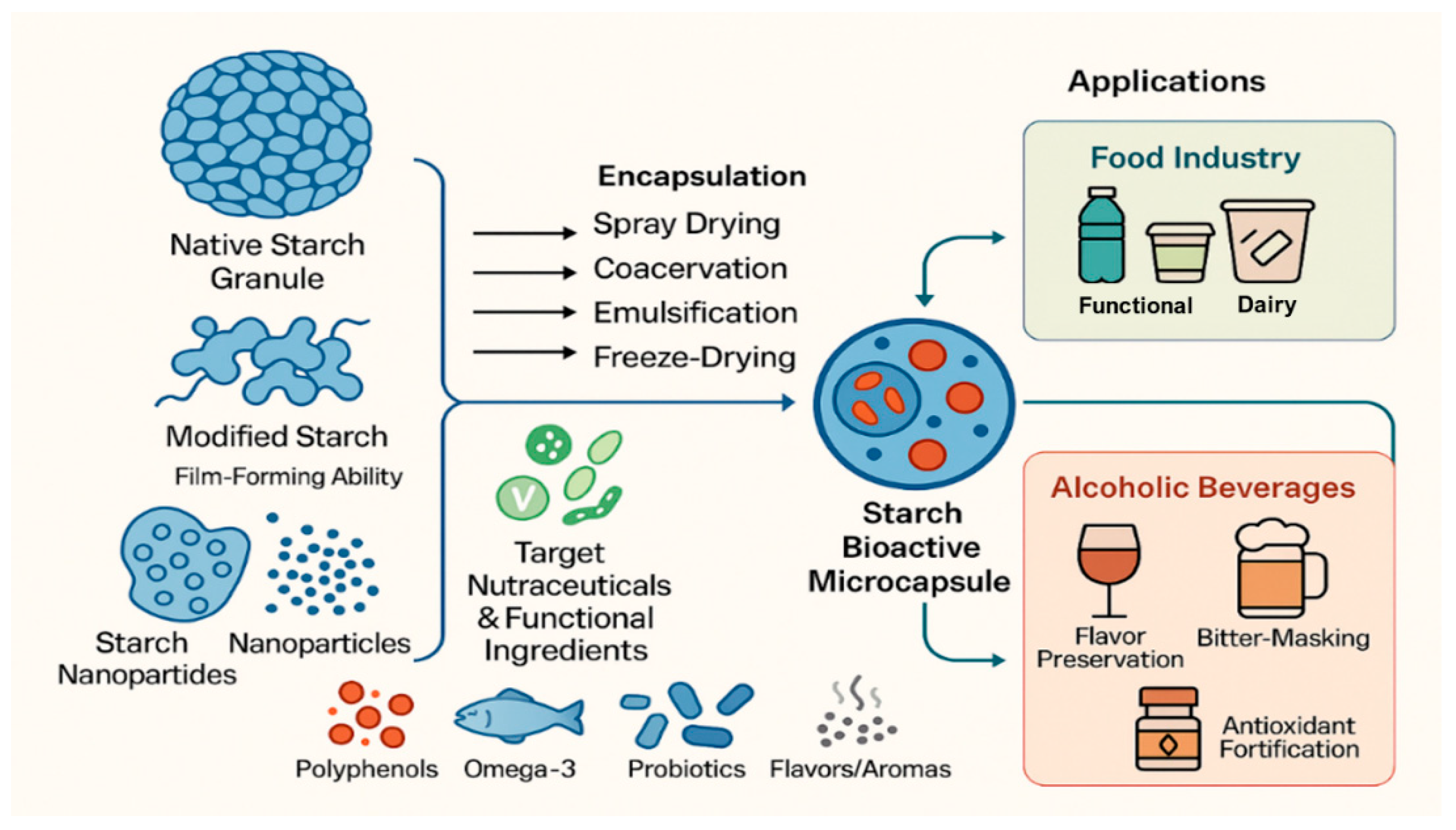 The encapsulation of bioactives and nutraceuticals using starch and its derivatives is an emerging, promising application across the food and beverage industries. This technology leverages the structural, functional, and biodegradable properties of starch-based materials to protect, stabilize, and control the release of sensitive compounds, including vitamins, polyphenols, omega-3 fatty acids, probiotics, flavors, essential oils, antioxidants, and bitter-masking agents, as well as poorly water-soluble nutraceuticals such as lutein, lycopene, and curcumin [