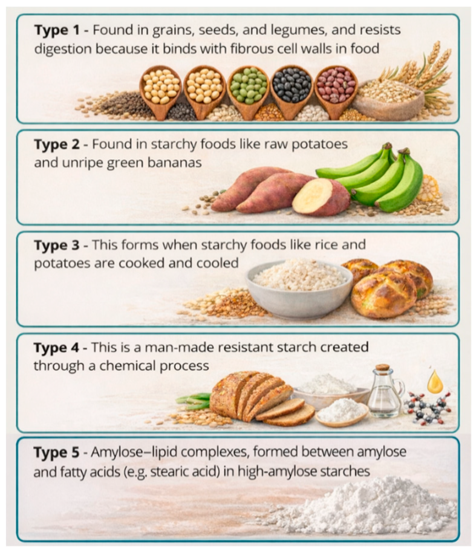 206]. Food processing methods, such as heating and cooling, can also significantly affect a product’s resistant starch content. Resistant starch is classified into five types based on its source and structure (