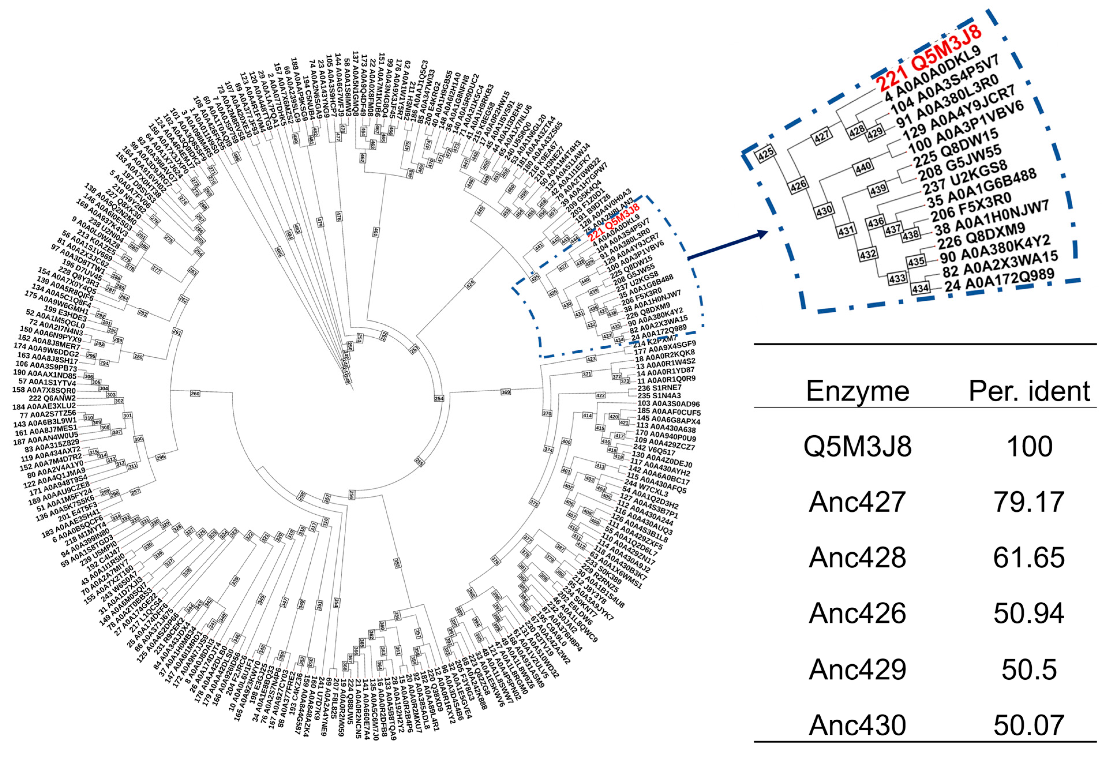 - Prakinee, K.; Phaisan, S.; Kongjaroon, S.; Chaiyen, P. Ancestral sequence reconstruction for designing biocatalysts and investigating their functional mechanisms. JACS Au 2024, 4, 4571–4591. [Google Scholar] [CrossRef] [PubMed]