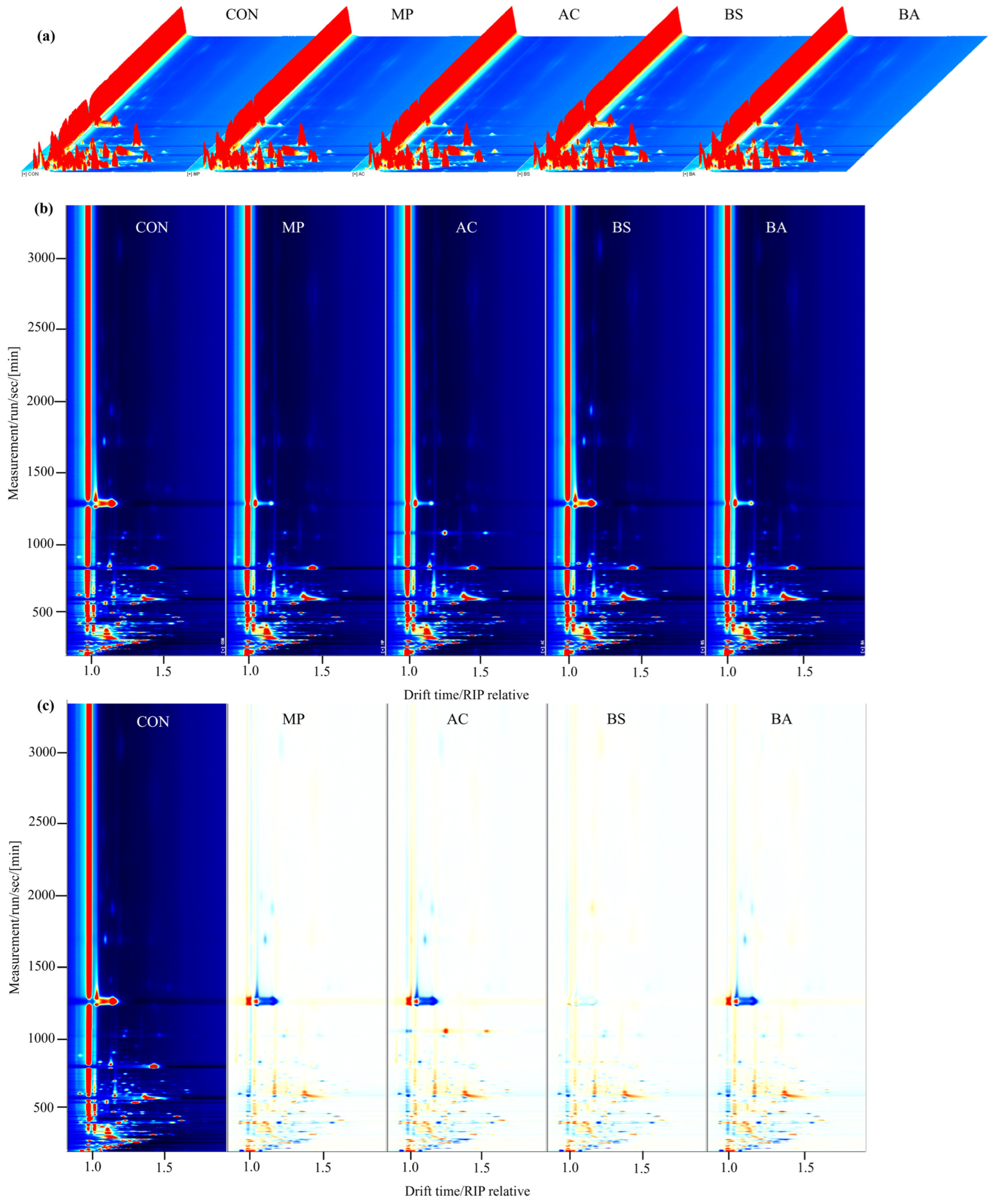 - Peng, L.; Wang, X.; He, M.; Sha, X.; Dou, Z.; Xiao, L.; Li, W. Discrimination and screening of volatile metabolites in Atractylodis rhizoma from different varieties using headspace solid-phase microextraction-gas chromatography-mass spectrometry and headspace gas chromatography-ion mobility spectrometry, and ultra-fast gas chromatography electronic nose. J. Chromatogr. A 2024, 1725, 464931. [Google Scholar]