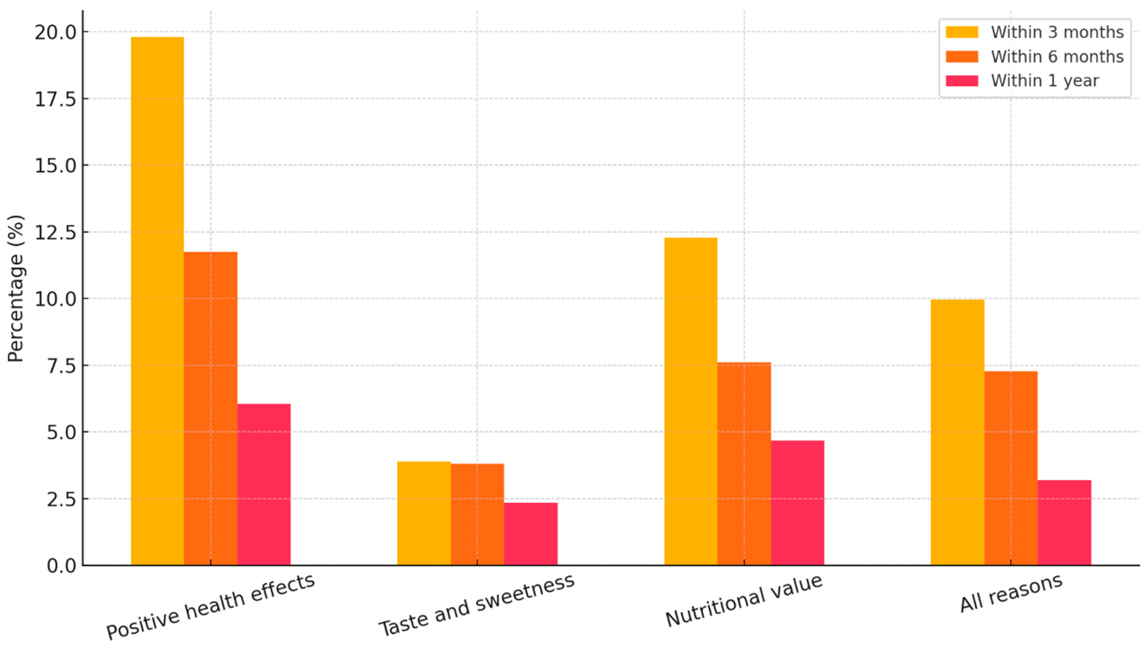 57]. They observed that health-related motivations, including the use of natural remedies and seeking cough relief, were primary drivers of winter honey consumption. However, more continuous, year-round use was also associated with higher income and health consciousness. Compared to these studies, the Kosovo results follow a similar seasonal pattern, reinforcing the idea that honey serves not only culinary but also preventive and therapeutic roles in consumer behavior. The relatively fast consumption timeframe (within 3 to 6 months for over 75% of users) further supports this functional interpretation. This may also reflect purchasing habits that prioritize freshness, local sourcing, or specific health needs rather than long-term storage. Overall, these patterns highlight the importance of understanding honey not only as a traditional or cultural product but also as a health-related commodity influenced by seasonal and temporal dynamics.