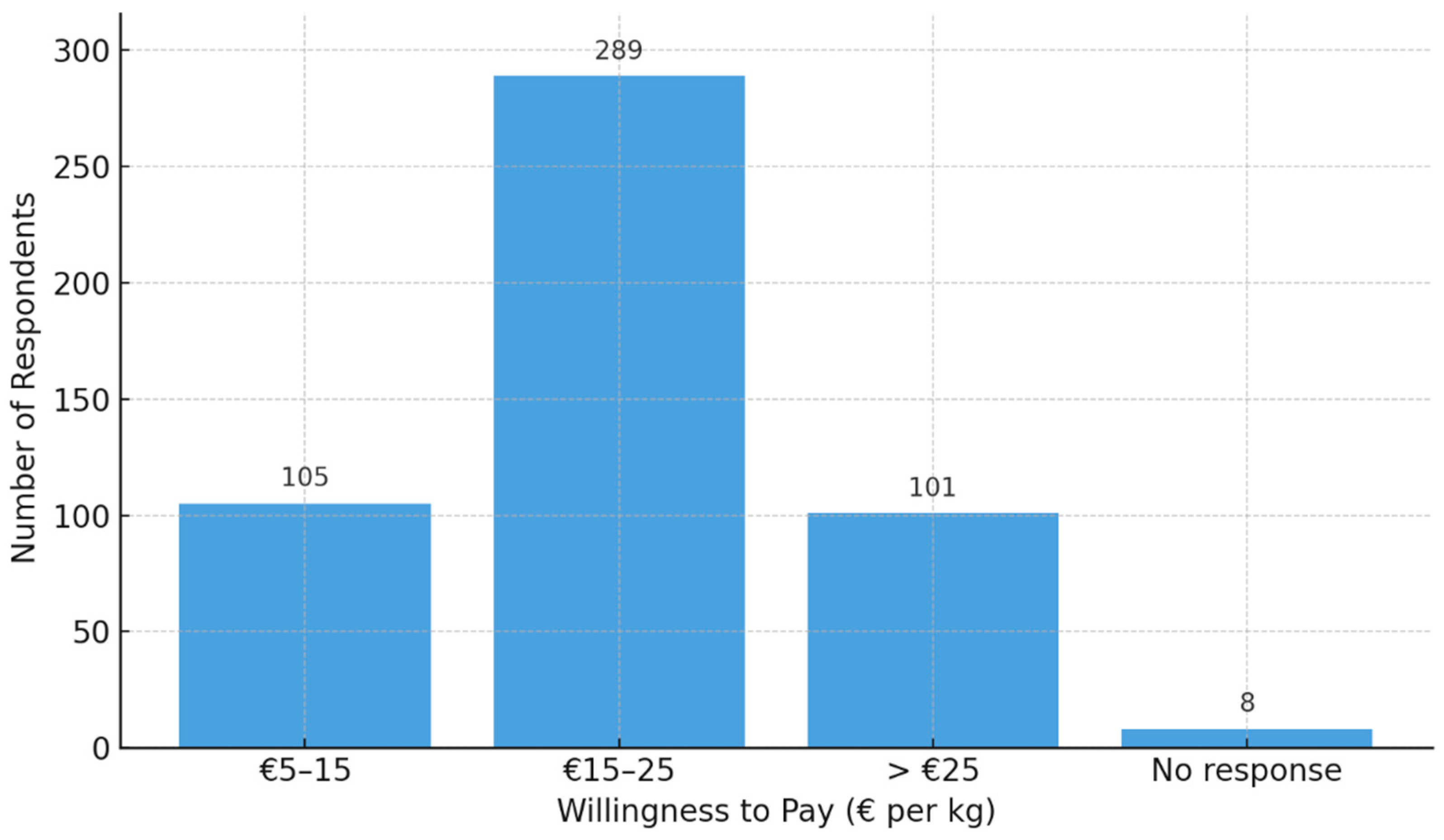 49]. One in five consumers is willing to pay more than EUR 25 per kilogram, which reinforces the presence of a quality-driven, possibly knowledge-rich segment, as also suggested by the ANN results, in which higher knowledge and trusted recommendations were strong predictors of WTP.