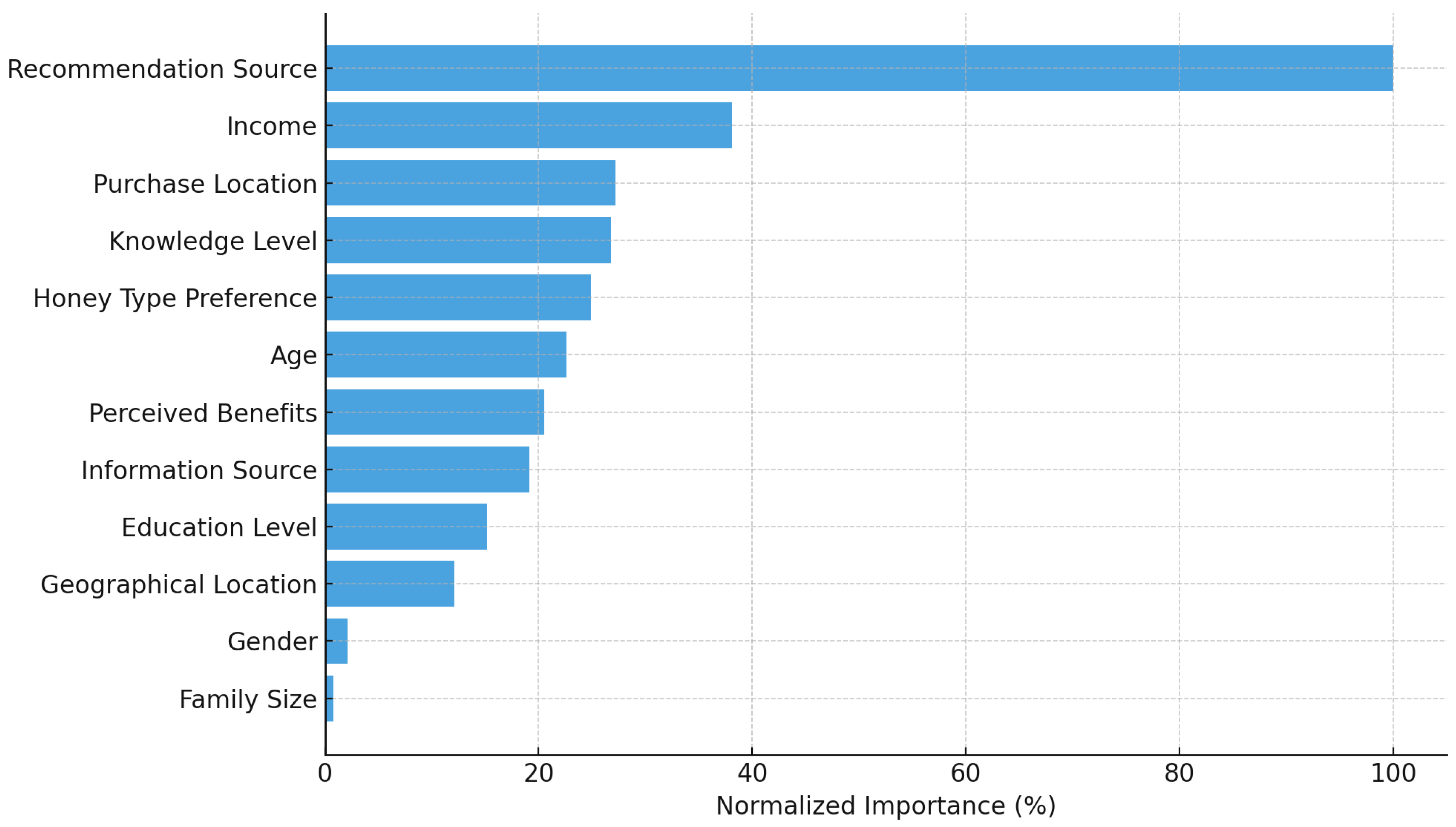 Figure 7) show that the model predicted mid-range WTP (category 2) with the highest accuracy, achieving a 97.2% correct classification rate on the test set. However, prediction accuracy was much lower for other categories, particularly the lowest and highest WTP segments, which were misclassified mainly. Analysis of independent variable importance revealed that the strongest predictor of WTP was whether someone had recommended the product to the respondent (normalized importance = 100%), followed by purchase location preference (27.2%), knowledge level about bee products (26.8%), and income level (38.1%). Other important factors included preferred honey type (24.9%) and perceived benefits from product use (20.5%). Demographic variables, such as gender, family size, and residential area, had a minimal influence on WTP predictions.