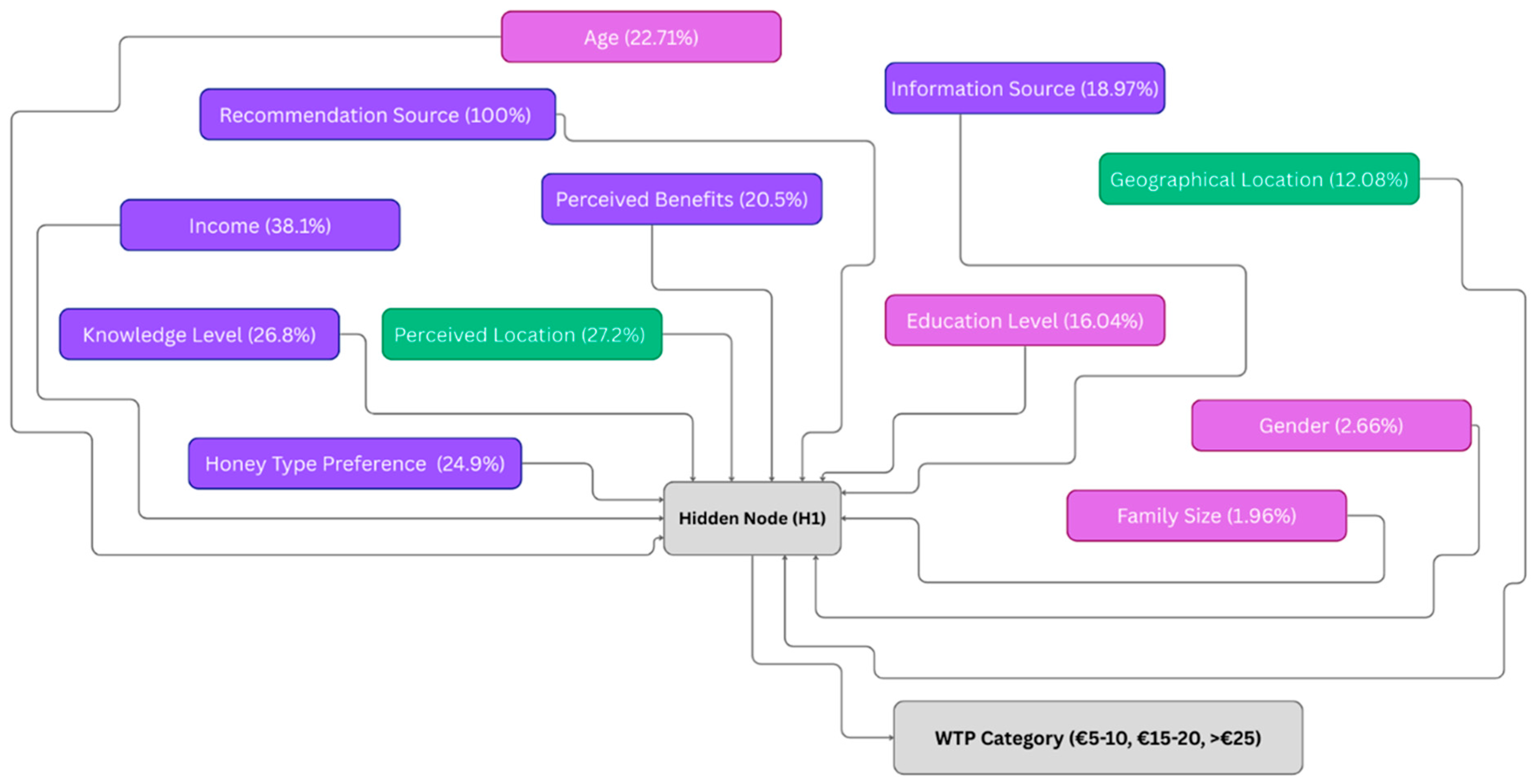 To identify the key factors influencing consumers’ willingness to pay (WTP) for honey, an Artificial Neural Network (ANN) model was developed using a multilayer perceptron architecture with one hidden layer. The dependent variable was WTP per kg of honey, categorized into four price levels, while a combination of behavioral, knowledge-based, and demographic variables served as predictors. The dataset included 503 observations, of which 239 were valid and used for training and testing after accounting for missing values. The model achieved a training accuracy of 71.2% and a testing accuracy of 55.1%, indicating moderate predictive performance. The cross-entropy error was 136.736 for the training set and 71.970 for the testing set, with error stabilization after one consecutive step.