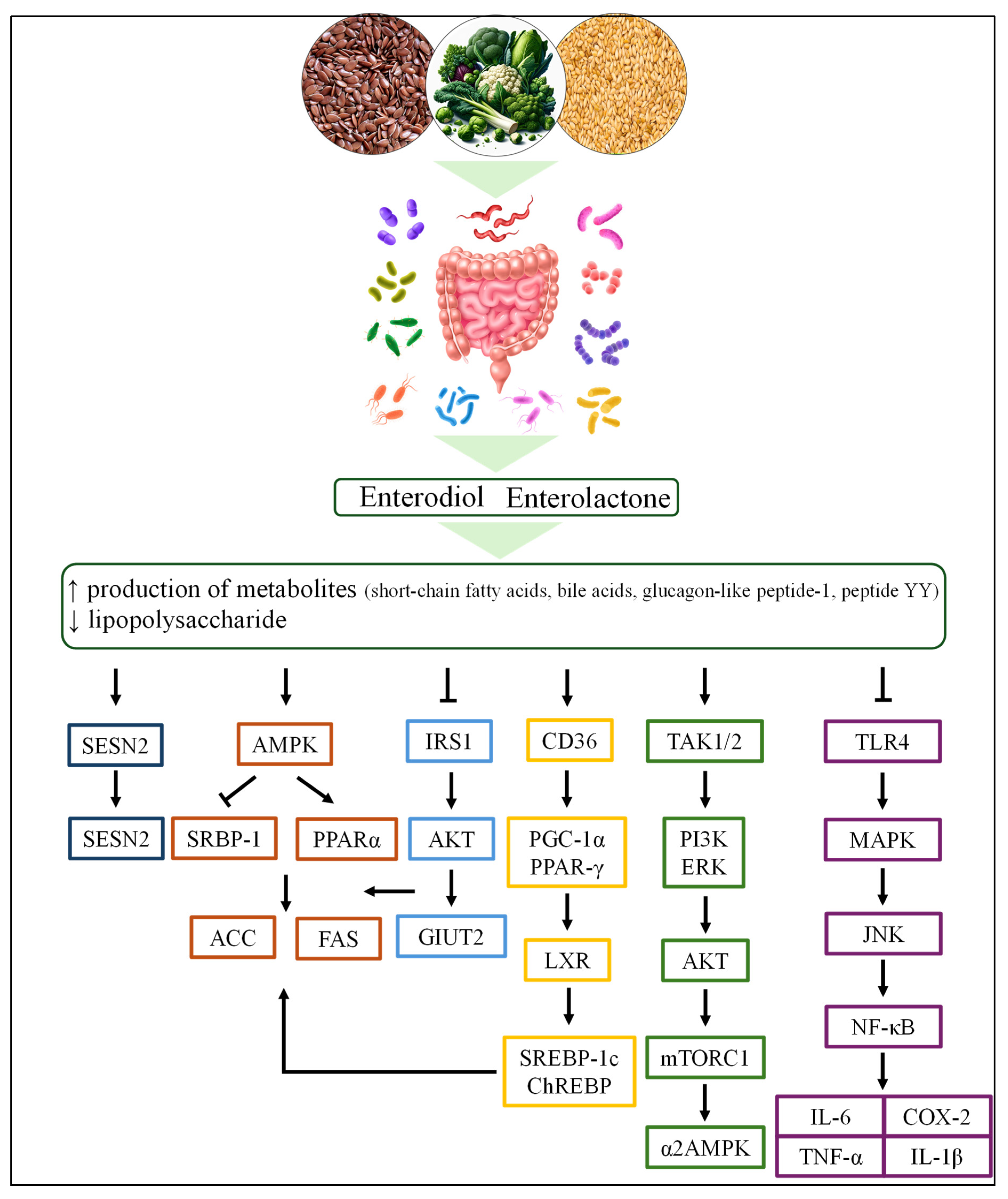 - Chu, Z.; Hu, Z.; Luo, Y.; Zhou, Y.; Yang, F.; Luo, F. Targeting gut-liver axis by dietary lignans ameliorate obesity: Evidences and mechanisms. Crit. Rev. Food Sci. Nutr. 2025, 65, 243–264. [Google Scholar]