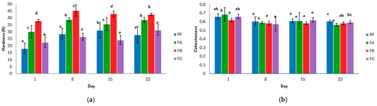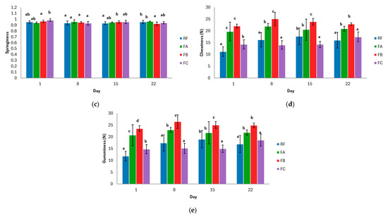 The parameters assessed were hardness, cohesiveness, springiness, chewiness, and gumminess, which were calculated from the force–time curve generated by the characteristic double-compression cycle of the TPA test [33].