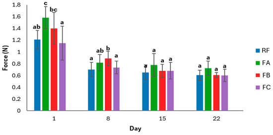 A stainless-steel needle probe (P/2N) was used, and the test parameters were as follows: pre-test speed of 0.6 mm/s, test speed of 0.6 mm/s, post-test speed of 10 mm/s, and a displacement of 20 mm. The maximum puncture force, expressed in Newtons, was recorded as the response variable. Eight replicates per formulation and per storage day were performed.