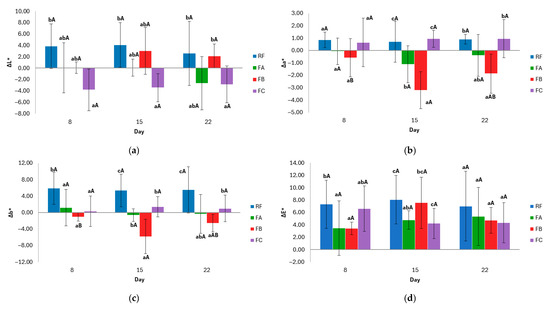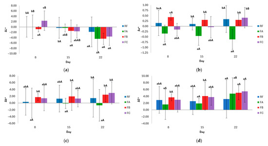 Evolution of crust color parameters during storage. (a) ΔL* (lightness), (b) Δa* (red–green coordinate), (c) Δb* (yellow–blue coordinate), and (d) ∆E* (total color difference). Values mean ± standard deviation. Two independent dough batches were prepared per formulation, and three slices per batch were analyzed for color measurements. Different lowercase letters indicate significant differences (p < 0.05) between formulations within the same day; different uppercase letters indicate significant differences (p < 0.05) within the same formulation over time. RF: Reference Formulation. FA: Removal of monocalcium phosphate. FB: Removal of monocalcium phosphate and sodium bicarbonate. FC: Removal of monocalcium phosphate, sodium bicarbonate, and mono- and diglycerides of fatty acids.