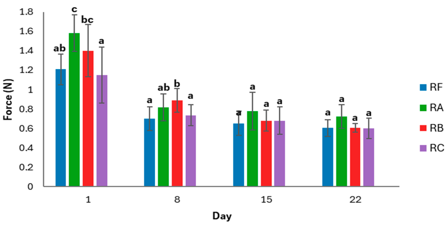 | Crust Puncture Force (N) | 1.21 ± 0.16 ab | 1.58 ± 0.19 c | 1.4 ± 0.3 bc | 1.2 ± 0.3 a |