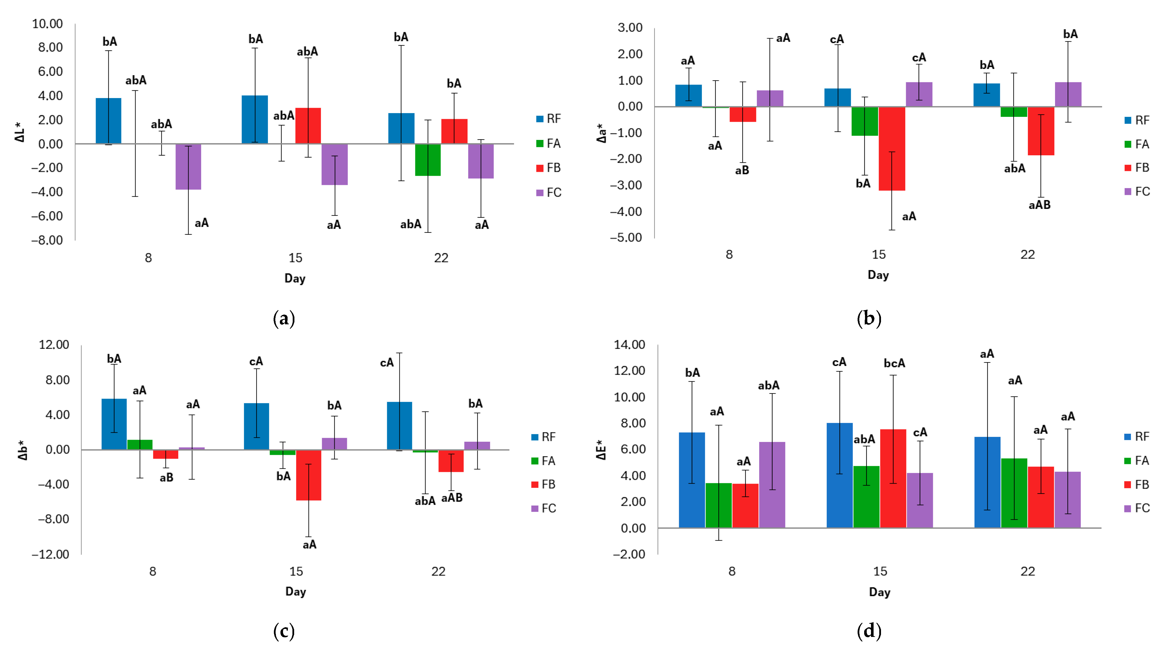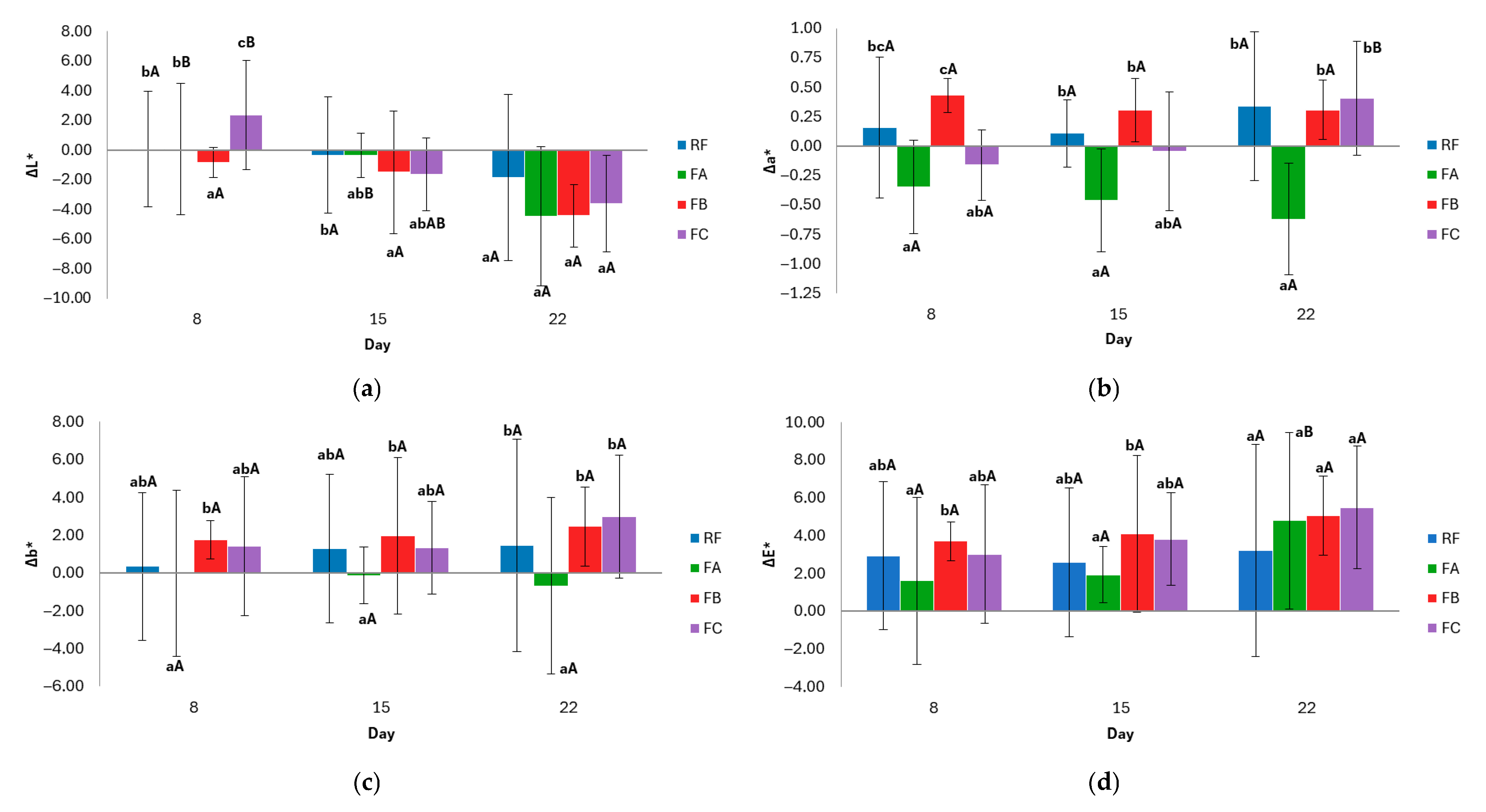| a* | −0.5 ± 0.3 a | 1.2 ± 0.6 b | −0.2 ± 0.3 a | −0.3 ± 0.4 a | |