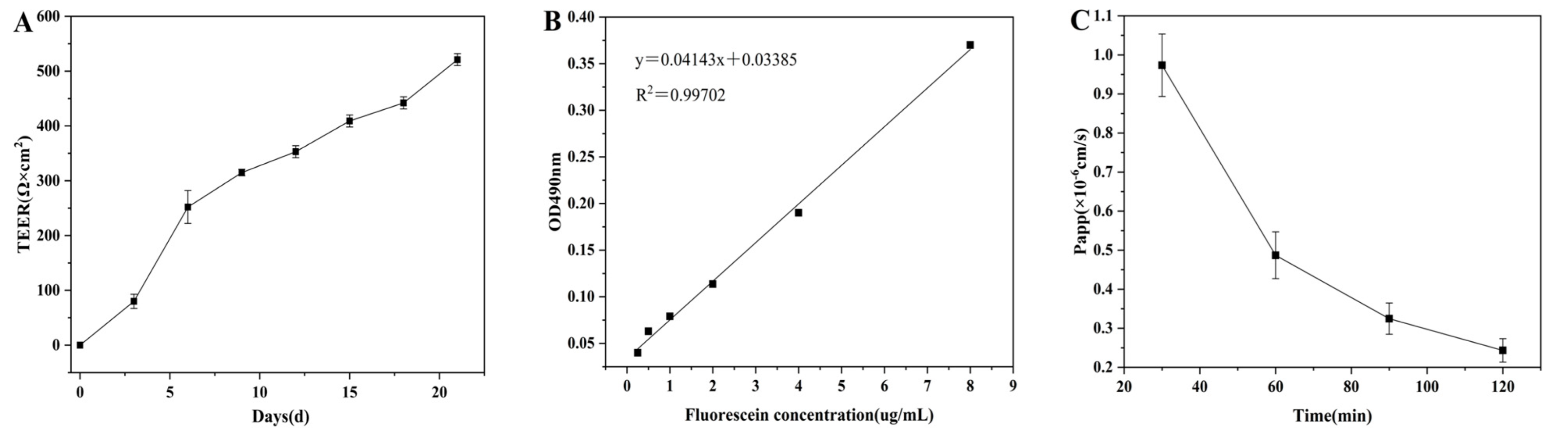 2.9.4. Caco-2 Measurement of Cell Transepithelial Electrical Resistance (TEER)