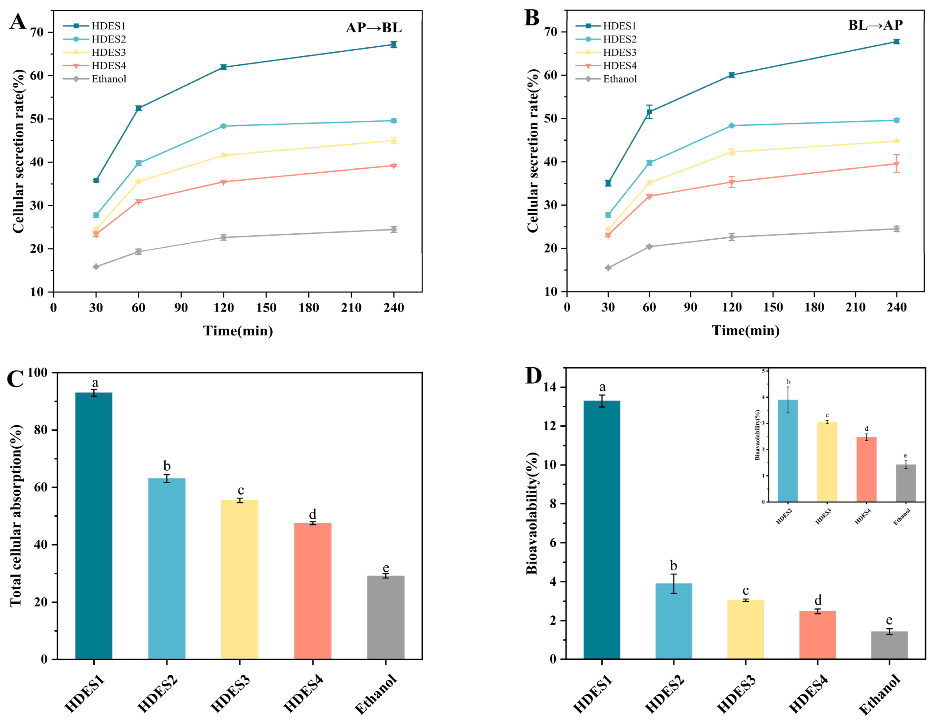 3.3.5. Total Cell Absorption Rate and Bioavailability