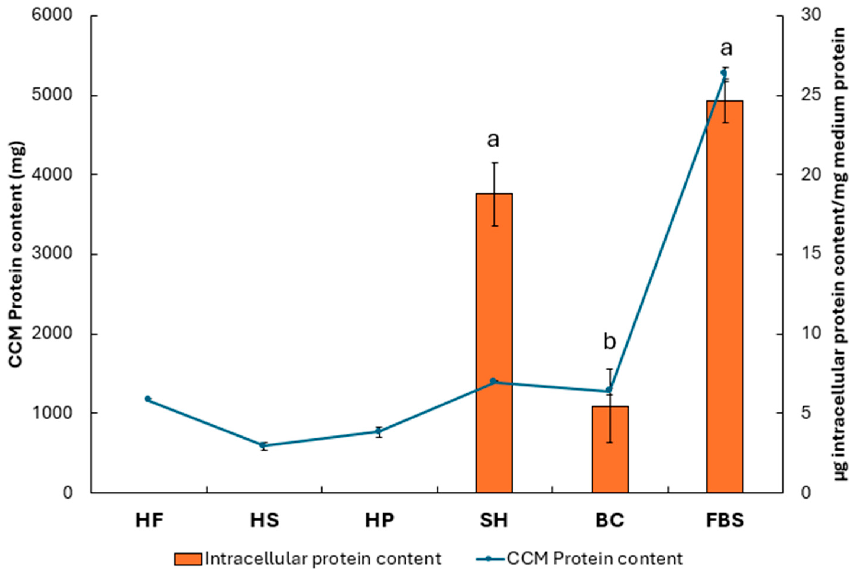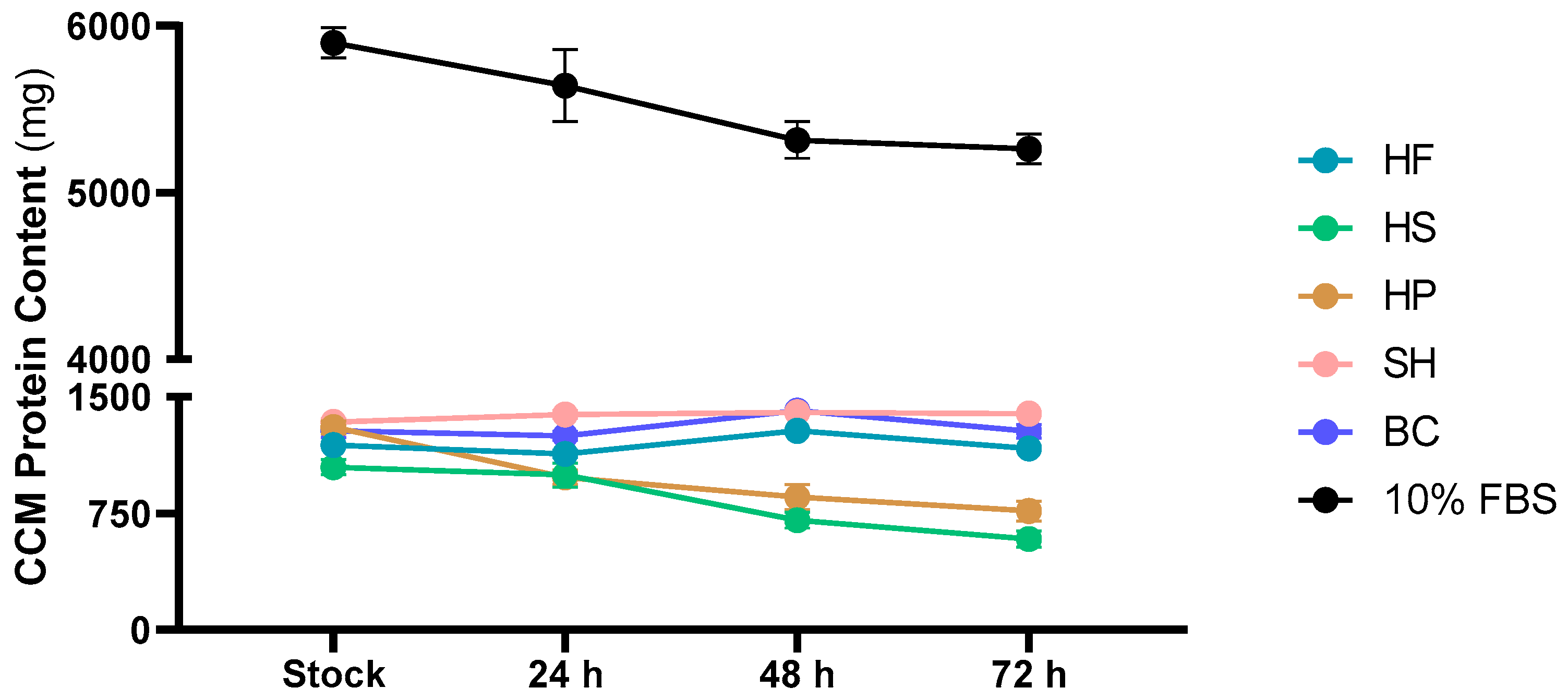 3.3. Evaluation of Protein Content in Cell Culture Media and in Cell Biomass