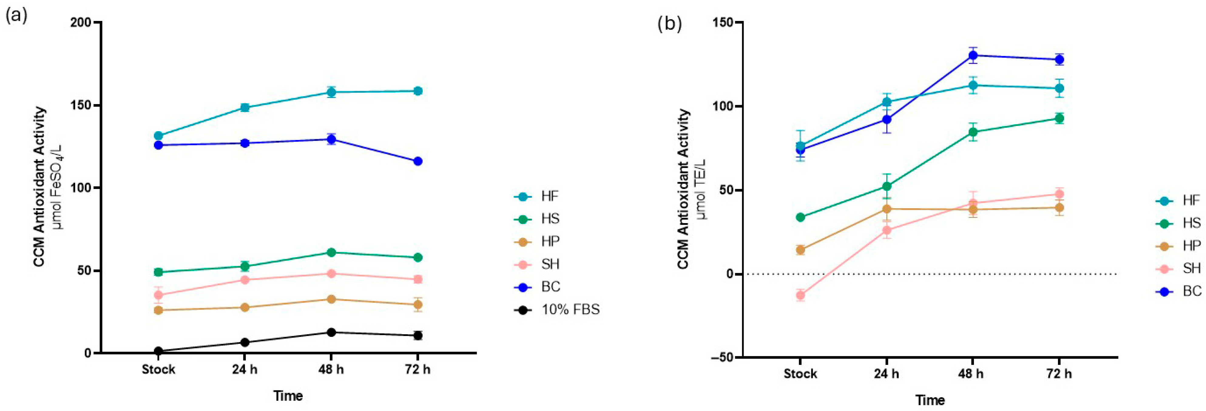 3.4. Evaluation of Antioxidant Activity in Cell Culture Media and in Cell Biomass