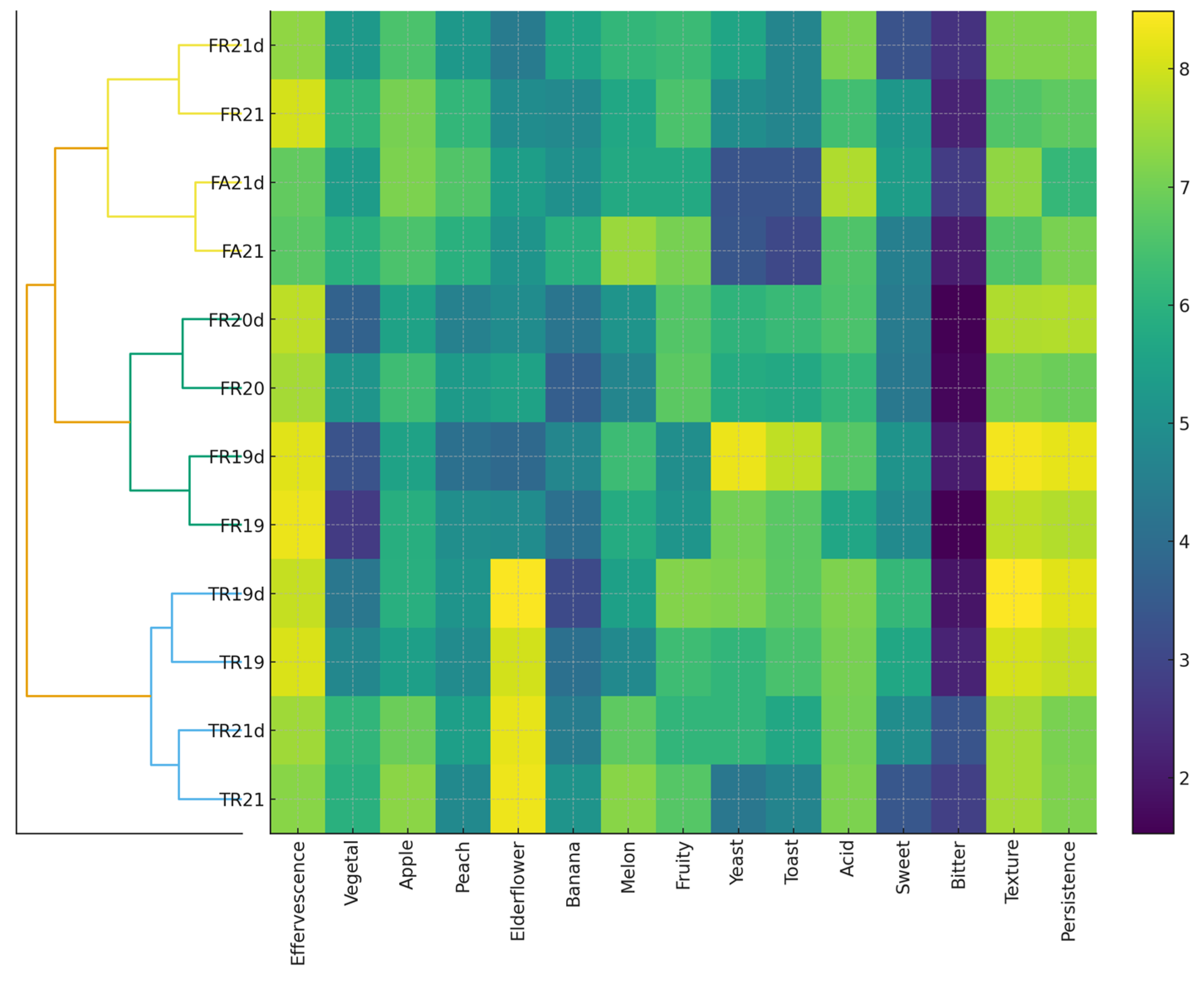 - Mihaela Dana Pop, A. The Influence of Physical-Chemical Parameters on the Sensory Evaluation of Sparkling Wines. Ann. ‘Valahia’ Univ. Târgovişte Agric. 2024, 16, 36–39. [Google Scholar]