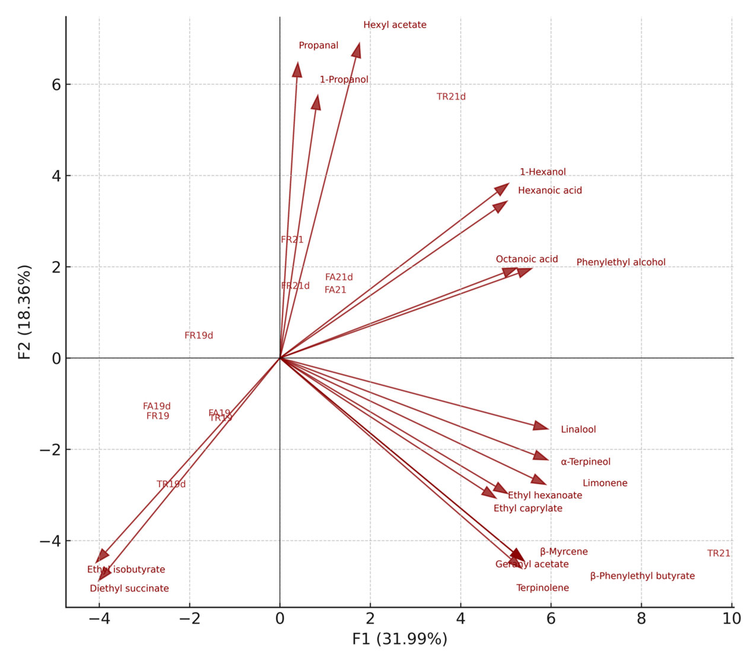 | Sample | Ethyl Formate | Ethyl Acetate | Ethyl Propionate | Ethyl Isobutyrate | Ethyl Butanoate | Ethyl Isovalerate | Isoamylacetate | Ethyl Hexanoate | Hexyl Acetate | Ethyl Caprylate | Ethyl Caprate | Butanedioic Acid, Diethyl Ester |