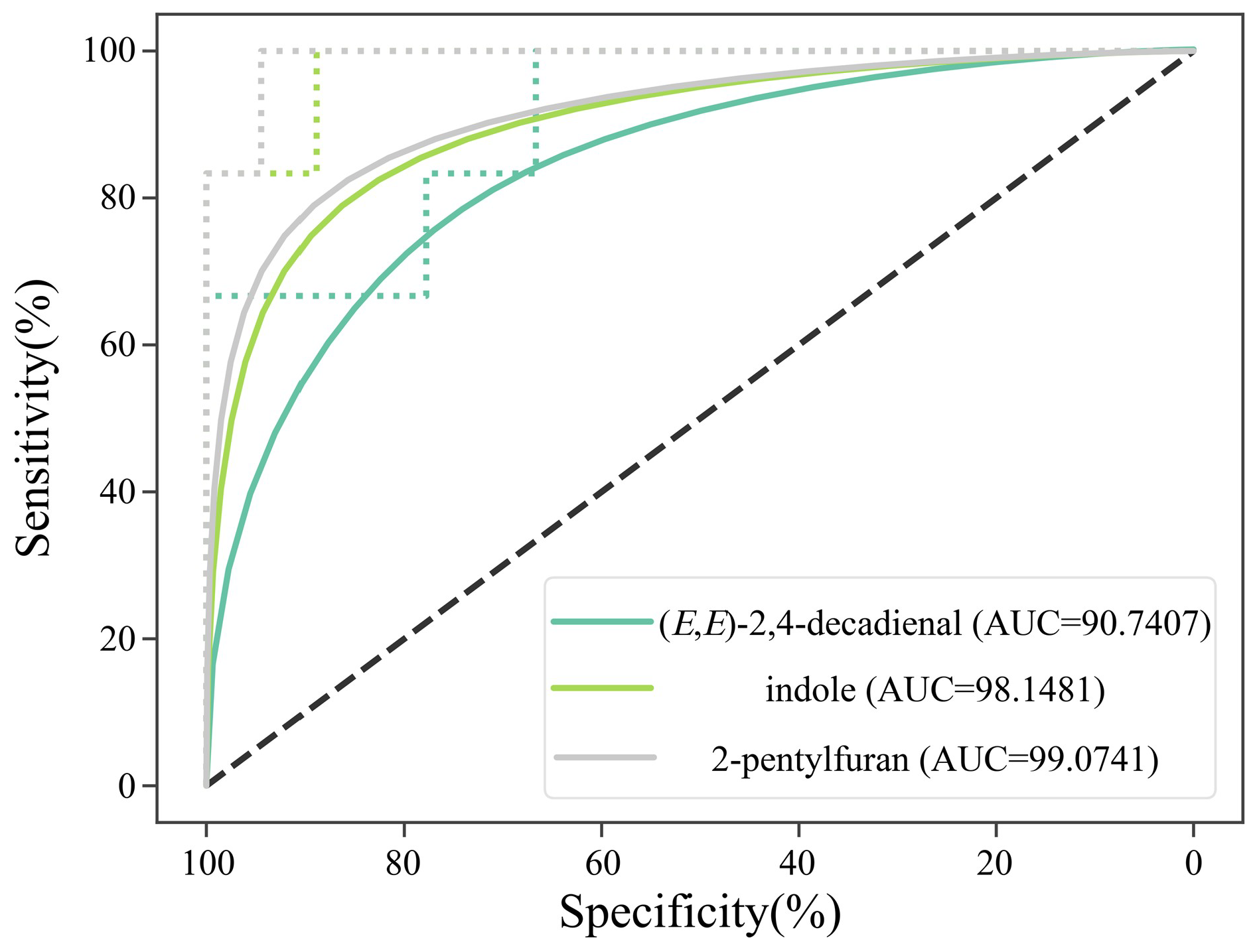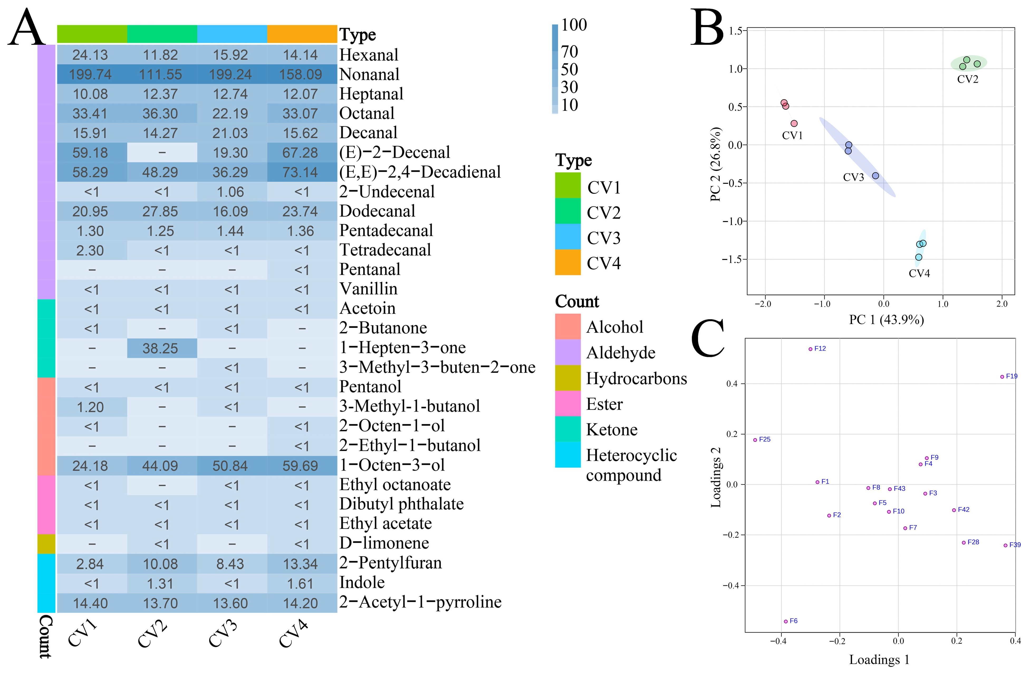 | F8 | 2-undecenal | sweet, fatty | sweet, fatty | 340 | 180 | 166 | 360 | 160 | 1365 | 1359 | MS, RI, O |
