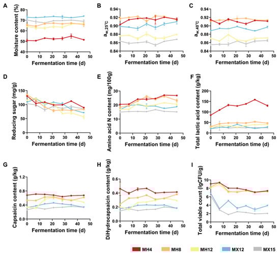 Physical and chemical indexes of different groups of chili mash fermentation during fermentation. (A) Change in water content. (B) aw of chili mash at 25 °C. (C) aw of chili mash at 40 °C. (D) Change in reducing sugar content. (E) Changes in amino acid nitrogen content. (F) Change in total acid content. (G) Change in capsaicin content. (H) Change in dihydrocapsaicin content. (I) Changes in total viable bacterial count.