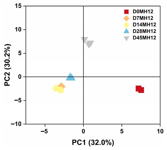 To further visualize the temporal dynamics of volatile and characterize overall flavor changes during fermentation, principal component analysis (PCA) was performed on the volatile of MH12. As shown in Figure 3, samples from different fermentation stages separated clearly in the PCA space, with no obvious outliers. Replicates at each time point formed distinct clusters, indicating good reproducibility of the volatile data. Day 0 samples (D0MH12, red) clustered closely on the right side of the score plot, reflecting similar intrinsic volatile compositions in the raw chili material at the start of fermentation. During fermentation, some day 7 samples (D7MH12, orange) were located near day 14 samples (D14MH12, yellow), suggesting partial continuity in volatile profiles between these early-to-mid fermentation stages. Day 14 samples clustered mainly in the lower-left quadrant, showing clear separation from day 0 samples. This distinct partitioning implies that fermentation-associated biochemical processes, including microbial metabolism, substantially altered the volatile profile. Day 28 samples (D28MH12, light blue) were predominantly distributed in the mid-left region and were separated from other time points, indicating a unique volatile signature at this stage. Day 45 samples (D45MH12, gray) clustered in the upper region and were distinct from all earlier stages, suggesting that the volatile profile had evolved toward a characteristic end-point composition consistent with the mature flavor of MH12.