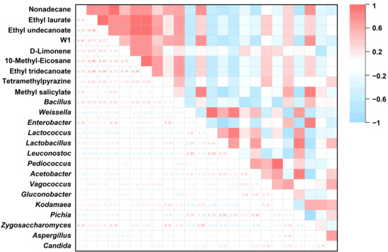 Additionally, Spearman’s rank correlation analysis was conducted via Origin (2024; OriginLab Corp., Northampton, MA, USA) to evaluate associations between the relative abundances of dominant genera and the concentrations of key volatile compounds. All experiments were performed in triplicate to ensure reproducibility.