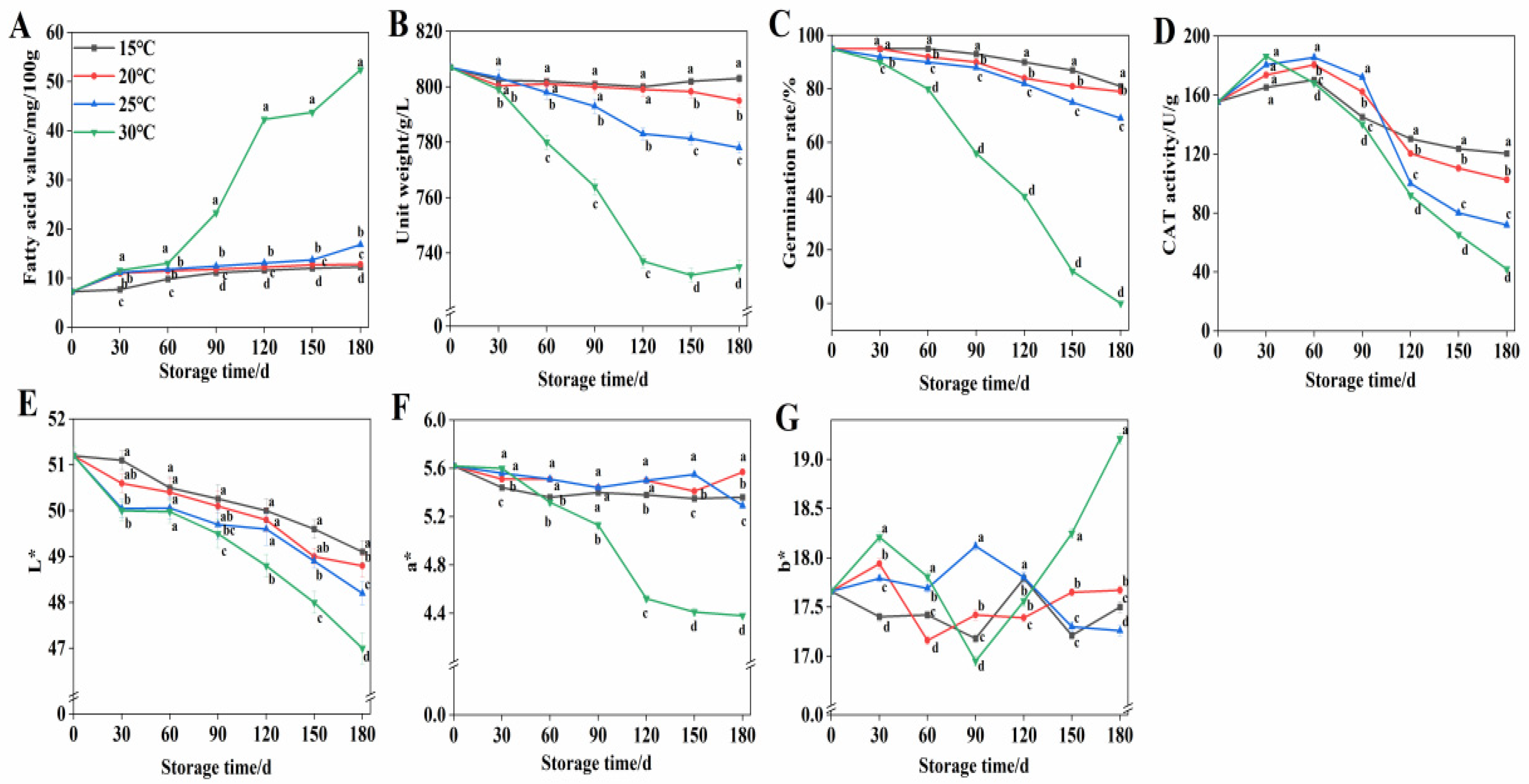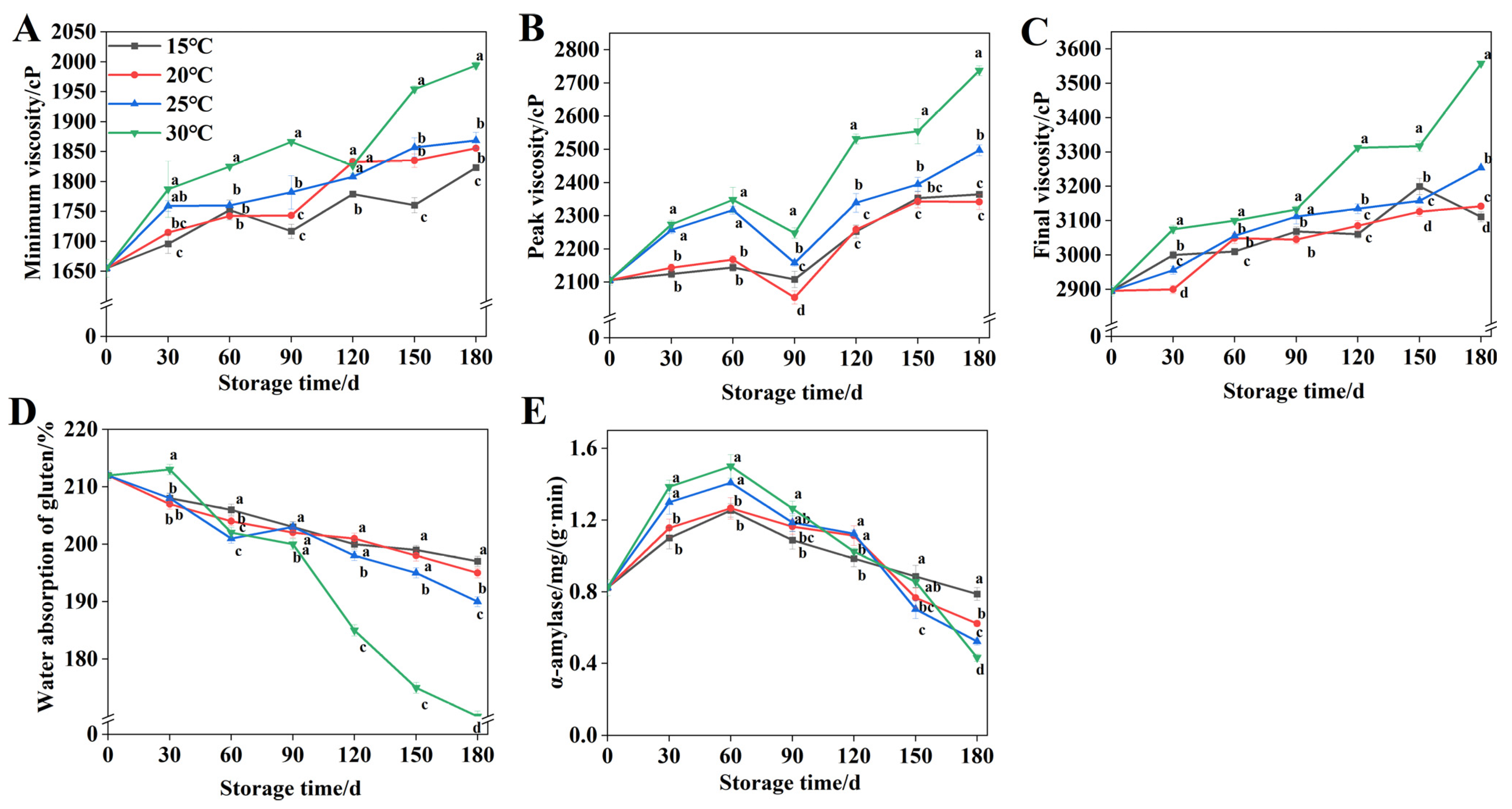 - Zhao, Y.; Han, G.; Li, Y.; Lv, H. Changes in quality characteristics and metabolites composition of wheat under different storage temperatures. J. Stored Prod. Res. 2024, 105, 102229. [Google Scholar] [CrossRef]