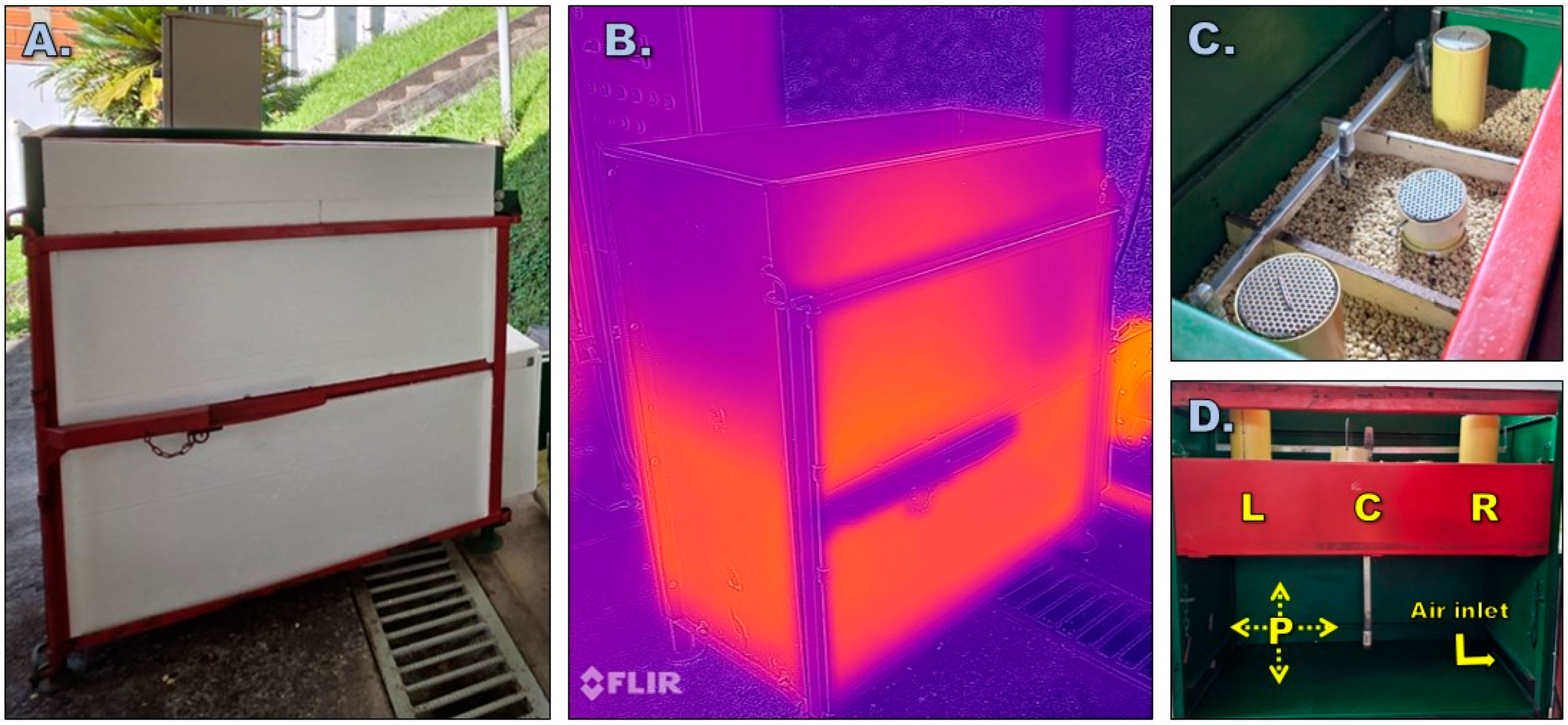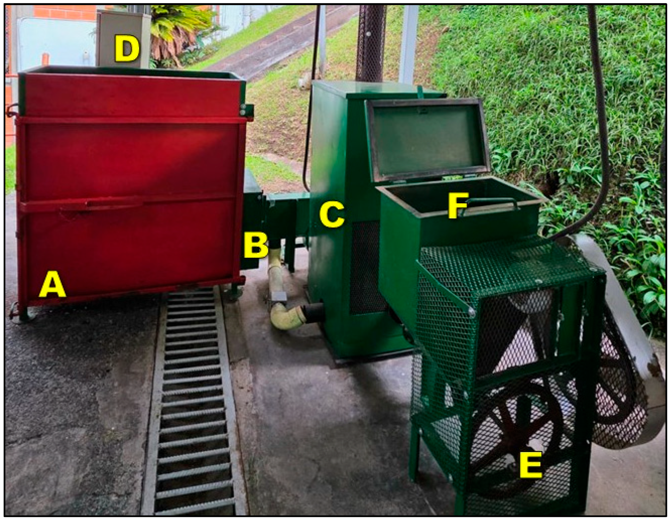 - Parra-Coronado, A.; Roa-Mejía, G.; Oliveros-Tascón, C.E.; Sanz-Uribe, J.R. Optimización Operacional de Secadores Mecánicos para Café Pergamino; Cenicafé: Manizales, Colombia, 2017; Volume 1, ISBN 978-958-8490-19-9. [Google Scholar]