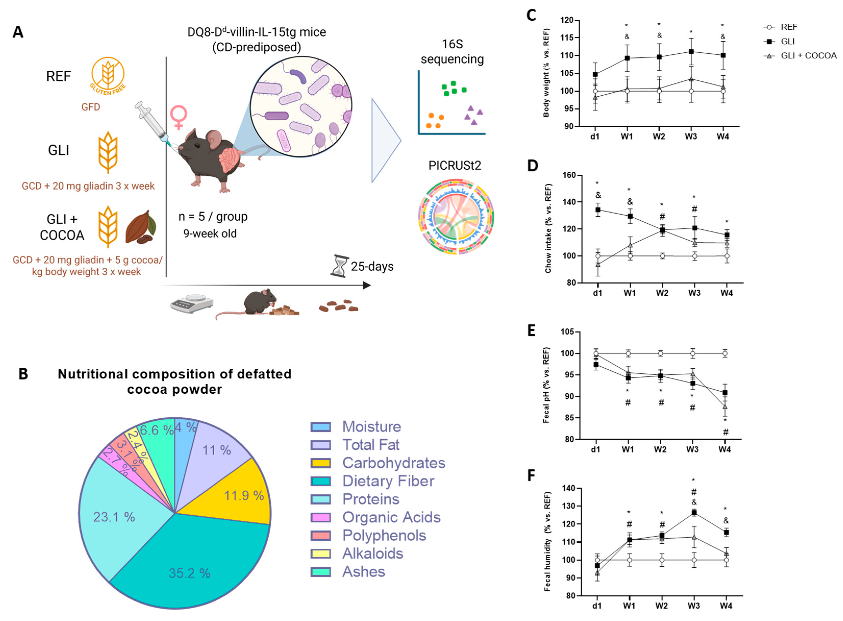 - Girbal-González, M.; Rodríguez-Lagunas, M.; Rodríguez-Banqueri, A.; Eckhard, U.; Gomis-Rüth, F.X.; Franch-Masferrer, À.; Pérez-Cano, F.J. Cocoa Attenuates Gluten-Induced Pathogenesis in a Preclinical Model of Celiac Disease. Mol. Nutr. Food Res. 2025. Submitted. [Google Scholar]