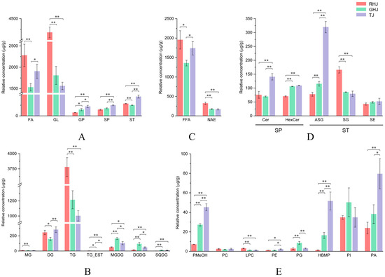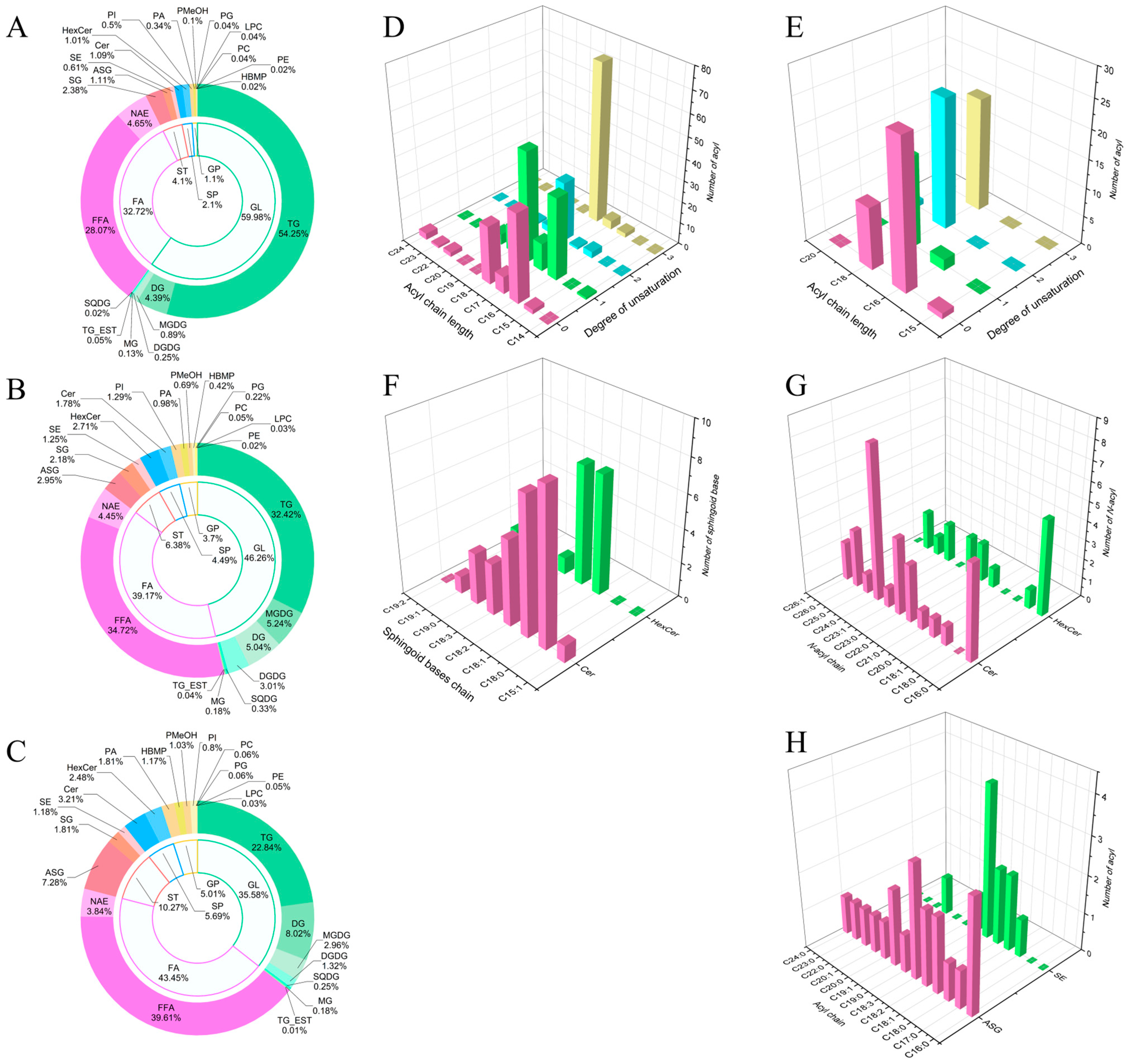 | Lipid Categories | Lipid Subclasses | Number of Identified Lipid Molecules | RHJ (Z. bungeanum) | GHJ (Z. schinifolium) | TJ (Z. armatum) | |||