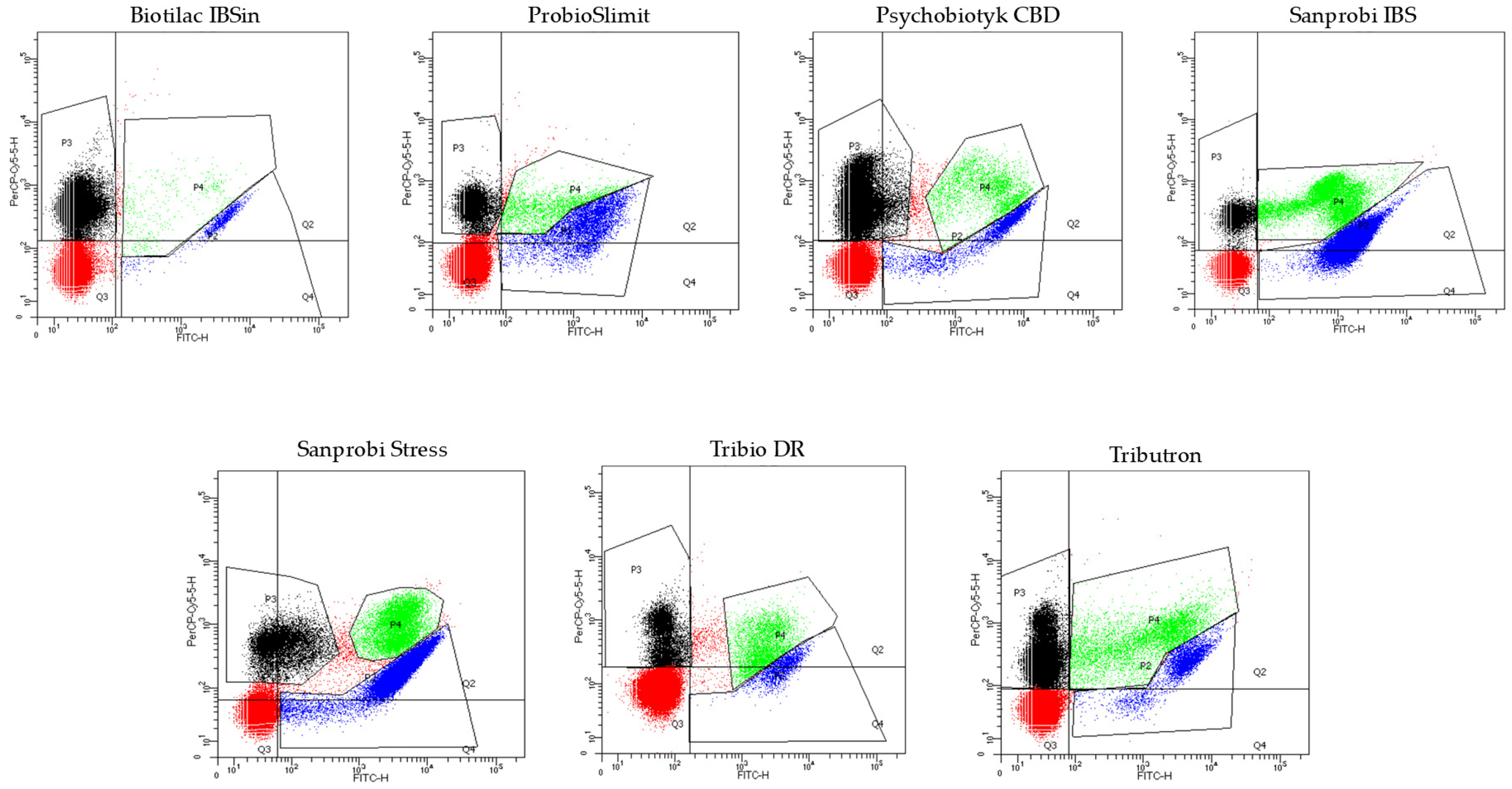 - Tracey, H.; Coates, N.; Hulme, E.; John, D.; Michael, D.R.; Plummer, S.F. Insights into the enumeration of mixtures of probiotic bacteria by flow cytometry. BMC Microbiol. 2023, 23, 48. [Google Scholar] [CrossRef] [PubMed]
