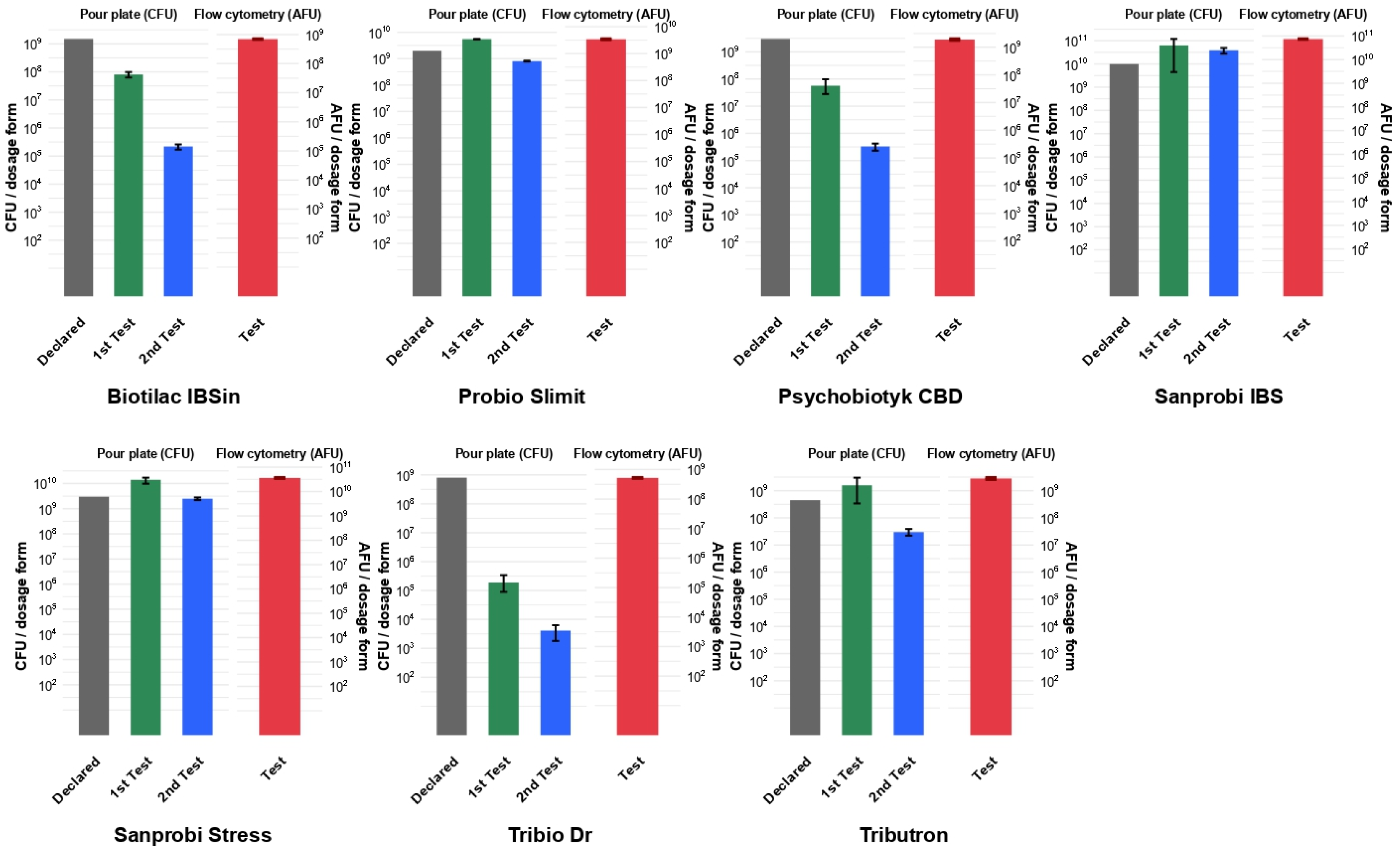 | Tributron | Bifidobacterium spp. Lactobacillaceae | 2.8 × 109 (2.6 × 109–3.0 × 109) | 2.5 × 1010 (2.3 × 1010–2.7 × 1010) |