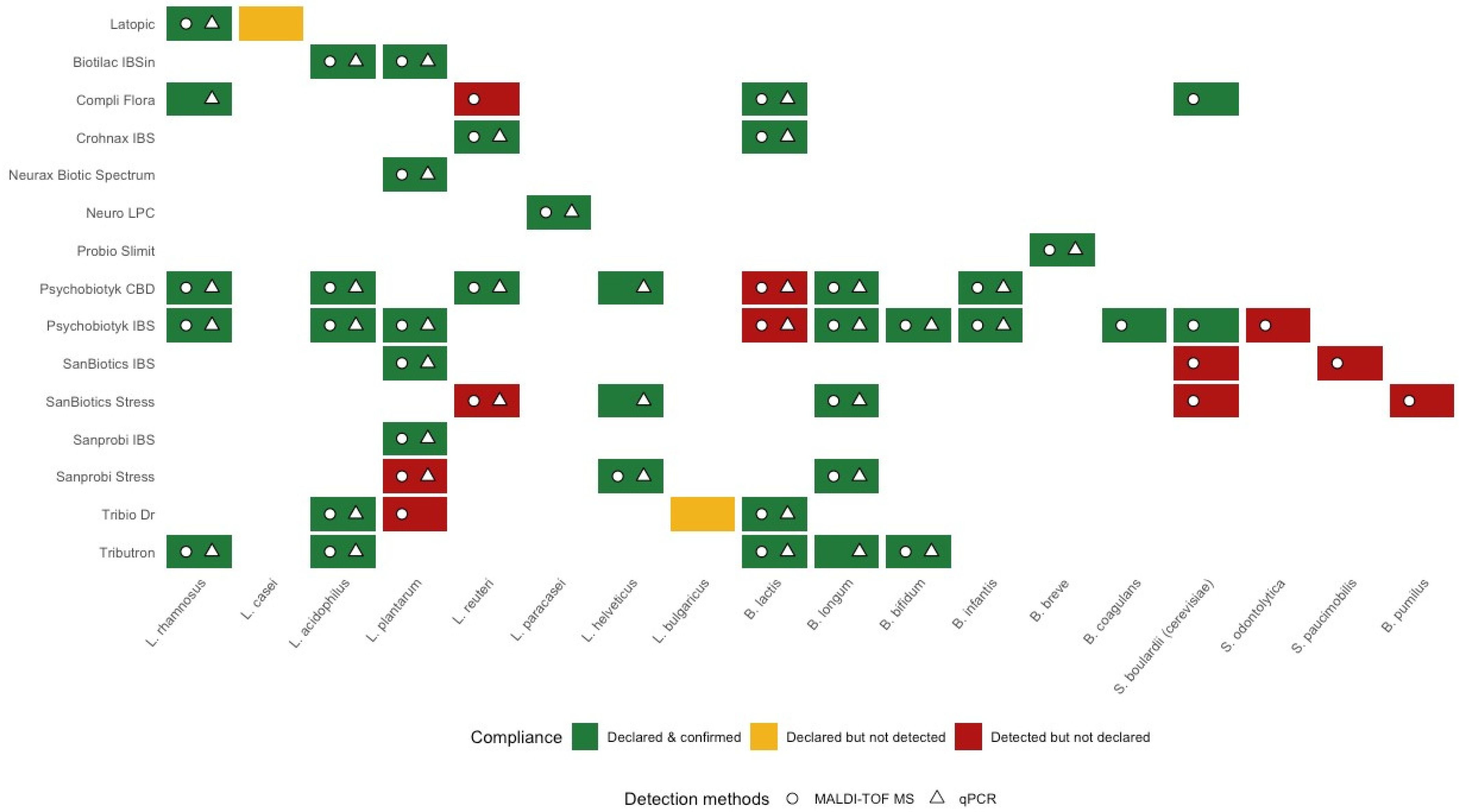 - Mazzantini, D.; Calvigioni, M.; Celandroni, F.; Lupetti, A.; Ghelardi, E. Spotlight on the Compositional Quality of Probiotic Formulations Marketed Worldwide. Front. Microbiol. 2021, 12, 693973. [Google Scholar] [CrossRef]
