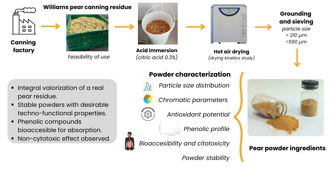 Gomez Mattson M, Diez S, Sette P, Corfield R, Garrido Makinistian F, Schebor C, Franceschinis L, Salvatori DM. Williams Pear Canning-Industrial Residues Suitable for Powdered Products: Effect of Particle Size and Acid Immersion on Physicochemical and Bioactive Properties. Foods. 2026; 15(2):377. https://doi.org/10.3390/foods15020377
