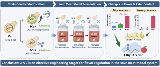 Zhao, N.; Yue, Y.; Yin, S.; Liu, H.; Jia, X.; Wang, N.; Ji, C.; Dai, Y.; Yin, L.; Liang, H.; et al. Genetic Modulation of ATF1 in Saccharomyces cerevisiae for Enhanced Acetate Ester Production and Flavor Profile in a Sour Meat Model System. Foods 2026, 15, 378. https://doi.org/10.3390/foods15020378