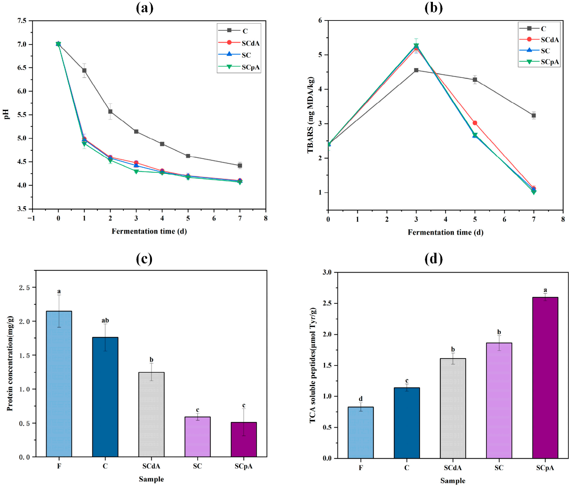3.2. Changes in Protein Concentration and TCA Content in the Sour Meat Model System
