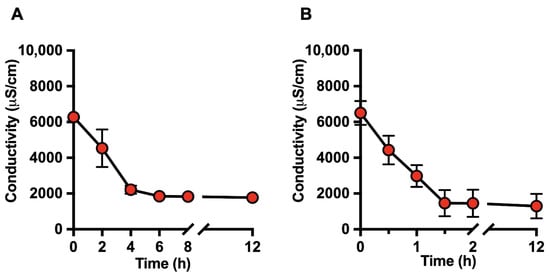 Figure 1A,B show the time-dependent decrease in milk electrical conductivity over a 12 h dialysis period using static and dynamic continuous-flow systems, respectively. Under static dialysis conditions, milk conductivity progressively decreased, reaching an approximate reduction of 70% after 6 h (Figure 1A). In contrast, a comparable reduction was detected much earlier in the dynamic continuous-flow dialysis system, with conductivity values decreasing by approximately 70% within 1.5 h (Figure 1B). In both systems, conductivity values remained stable thereafter, indicating that ionic equilibrium had been reached.