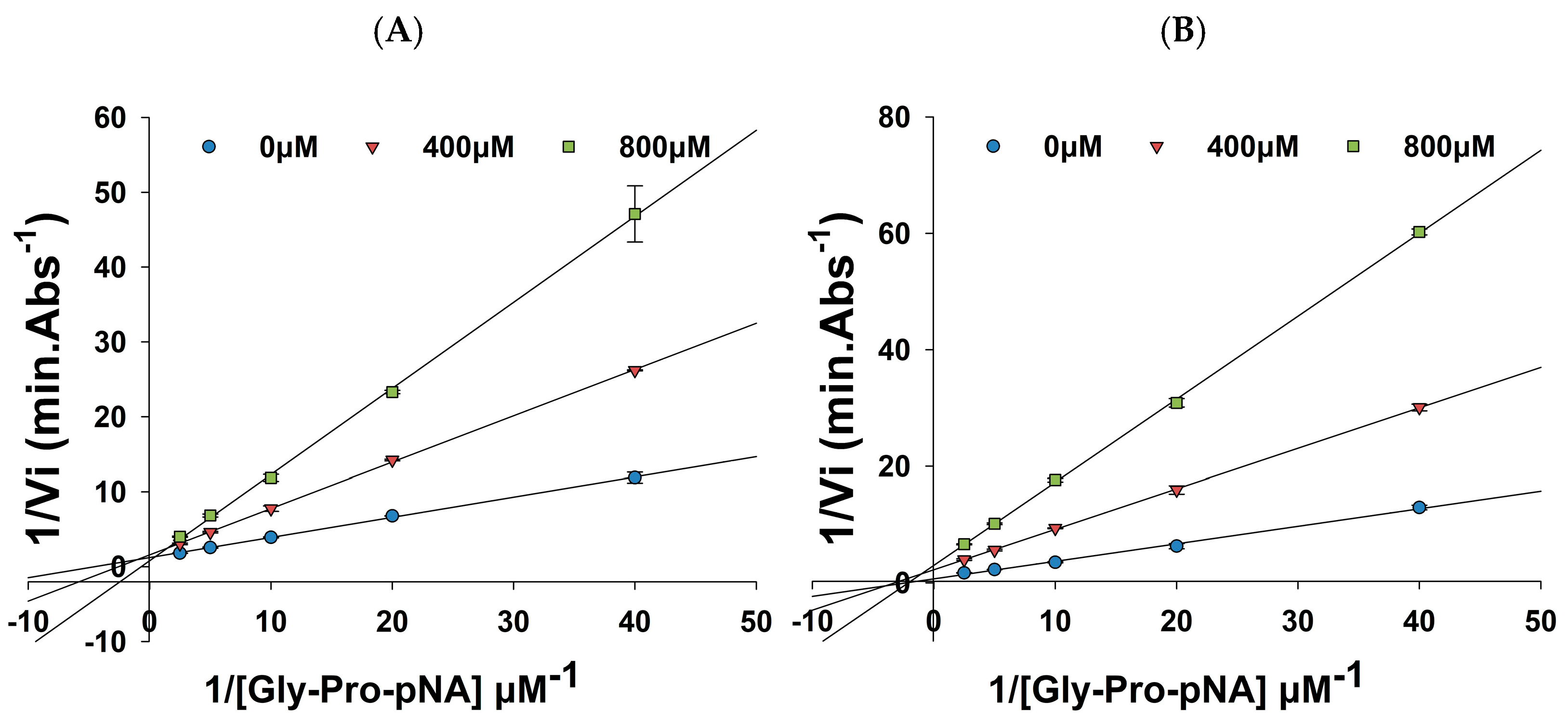 3.6. Inhibition Kinetics of Synthetic Peptides