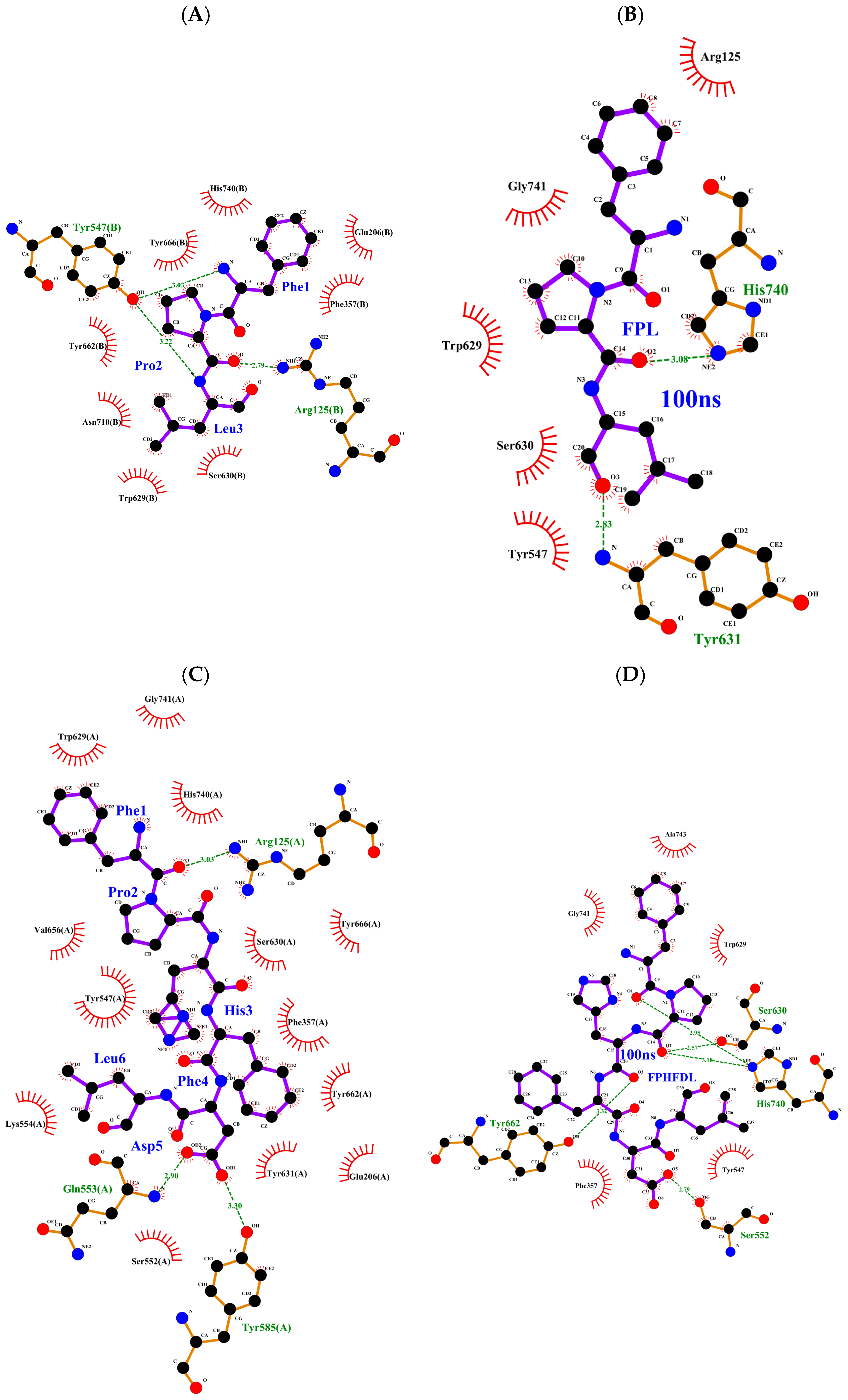 | FPHFDL | −9.2 | Phe1 | Arg125 (3.03 Å) | Glu206, Trp629, Gly741, His740, Tyr666, Val656, Tyr547, Ser630, Phe357, Tyr662, Lys554, Tyr631, Ser552. | |