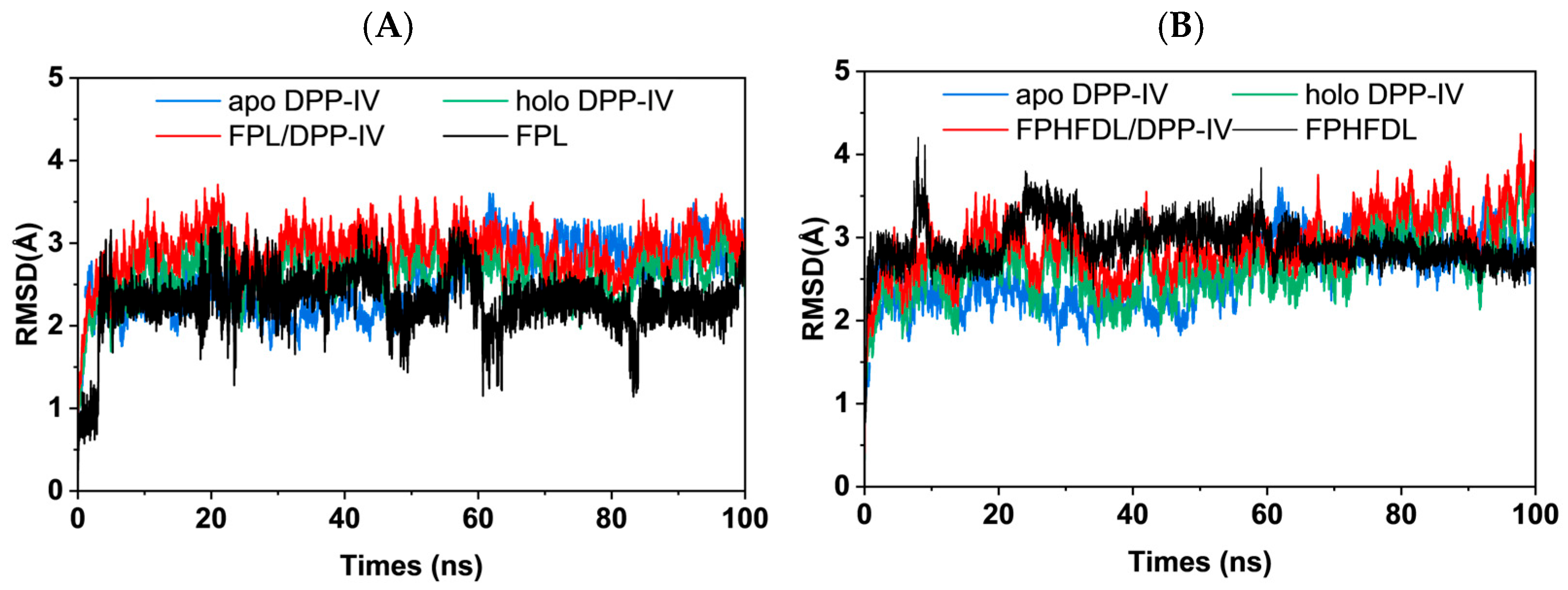 - Wang, C.; Zheng, L.; Udenigwe, C.C.; Lin, L.; Zhao, M. Molecular Mechanistic Insights into Dipeptidyl Peptidase-IV Inhibitory Peptides to Decipher the Structural Basis of Activity. J. Agric. Food Chem. 2024, 72, 11230–11240. [Google Scholar] [CrossRef]