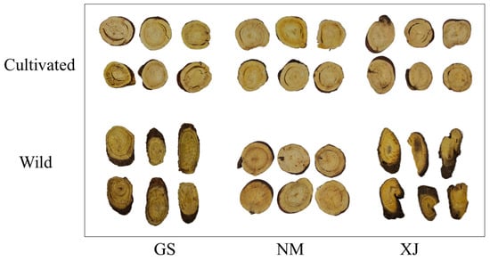 Representative photographs of licorice slices from different geographical origins and growth modes.