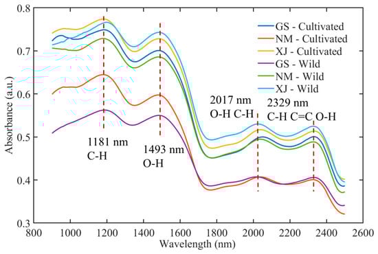 The raw NIR spectra of licorice samples collected from different geographical origins and cultivation types are presented in Figure 3. The spectra exhibited characteristic absorption bands associated with major functional groups, reflecting the complex chemical matrix of licorice [37]. Prominent absorption peaks were observed around 1181 nm (C–H stretching overtones), 1493 nm (O–H first overtone), 2017 nm (combination bands of O–H and C–H), and 2329 nm (C–H, C=O, and O–H combinations) [38]. These bands are closely correlated with key bioactive constituents, including saponins, flavonoids, and polysaccharides. While the general spectral profiles followed a consistent trend across all samples, variations in absorbance intensity and band sharpness were noted among origins (Gansu, Inner Mongolia, and Xinjiang) and growth modes (wild vs. cultivated), attributable to the influence of distinct ecological environments on metabolite accumulation [39].