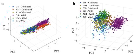 In contrast, after applying the systematic preprocessing workflow, the PCA score plot (Figure 5b) exhibited markedly improved discrimination. Samples from Gansu, Inner Mongolia, and Xinjiang formed distinct, well-defined clusters, with clear sub-groupings observed between cultivated and wild resources. The transition from the disordered overlap in Figure 5a to the structured clustering in Figure 5b confirms that the preprocessing pipeline effectively suppressed spectral artifacts, improved the signal-to-noise ratio, and amplified chemically relevant features. These results establish a robust, high-quality data foundation for the subsequent development of supervised classification models.