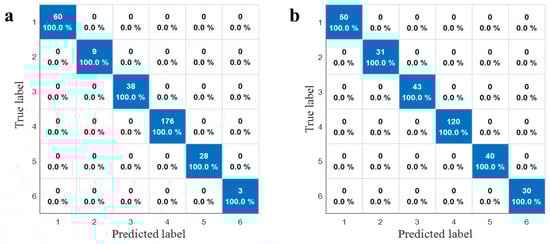 Confusion matrices of SVM models based on different data partitioning algorithms. (a) Kennard–Stone (KS) algorithm; (b) stratified sampling.