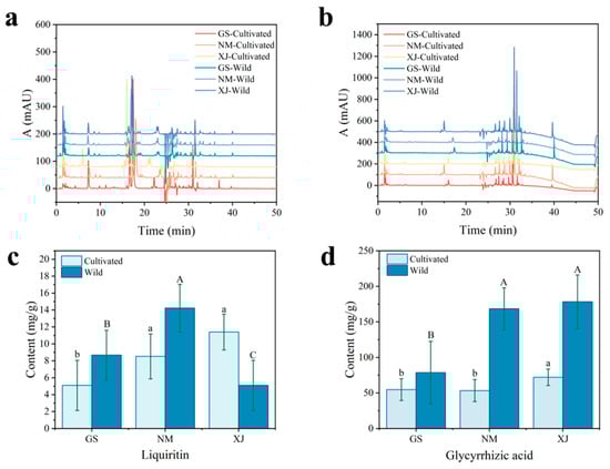 HPLC chromatograms and active ingredient contents of wild and cultivated licorice samples from different geographical origins. (a) Chromatograms at 274 nm (Liquiritin); (b) Chromatograms at 254 nm (Glycyrrhizic acid); (c) Content of liquiritin; (d) Content of glycyrrhizic acid. Data are expressed as mean ± SD (n = 75). Different lowercase letters (a, b) and uppercase letters (A, B) indicate statistically significant differences (p < 0.05) among cultivated and wild samples, respectively.